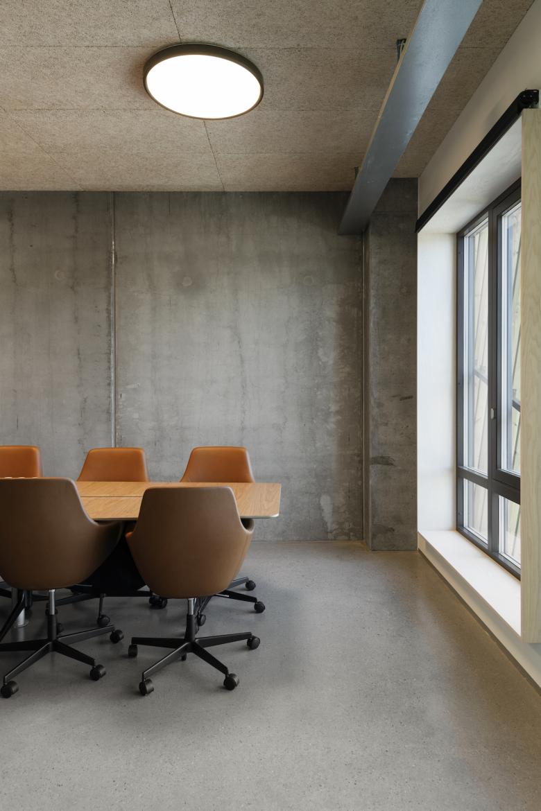 The material palette of Powerhouse Telemark is chosen for its environmentally sustainable qualities. Throughout, the building features sturdy materials known for resilience and low-embodied energy. This means using materials such as local wood, gypsum and environmental concrete which is left exposed and untreated. Everything from the kitchens to the carpet tiles and loose furniture are made from durable and high-quality materials. The carpet tiles are composed of 70% recycled fishing nets and the wooden flooring is made from industrial parquet of ash from wooden debris. Moreover, a specially designed foliating signage system allows for a certain amount of flexibility in tailoring the visual expression of the different office spaces without creating unnecessary waste that may be generated when brand specific signage is removed or produced.