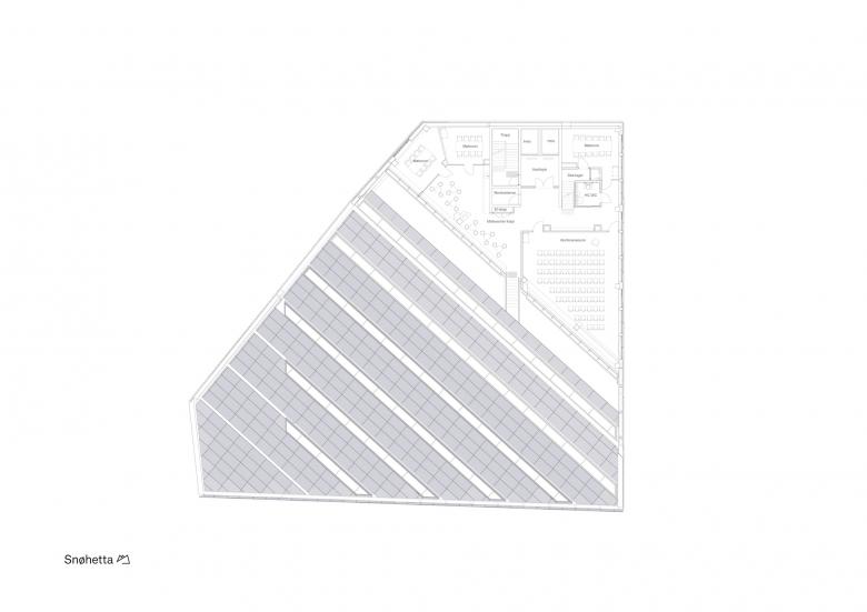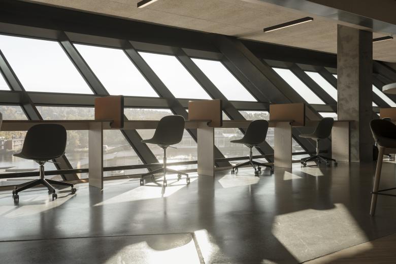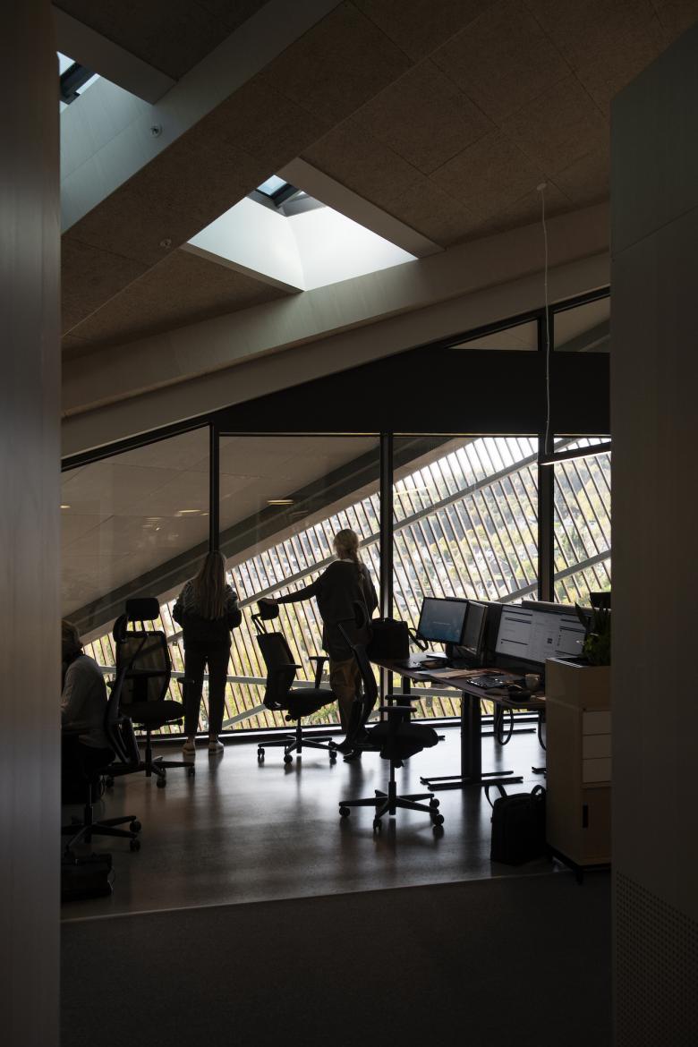 Powerhouse Telemark also utilizes a series of low-tech solutions to ensure that tenant comfort is prioritized, allowing the office building to be used to its full potential. The building’s gently skewed West-facing and South-East-facing facades allow for a maximum of daylight and shading while also generating views and flexible indoor spaces. To the North-East the building is leveled to accommodate for more traditional workspaces with enclosed offices. Throughout the building, small, secluded spaces are strategically moved away from sun exposed facades to reduce the need for cooling while also assuring that these spaces keep a comfortable temperature.