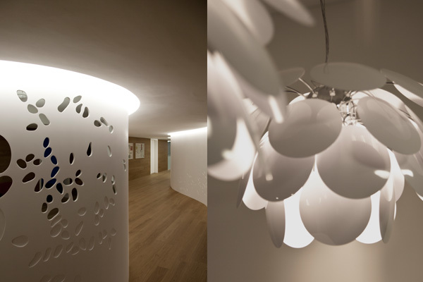 Die Innenarchitektur der Kinderwunschklinik im Gewerbehaus Puls 5 zeichnet sich durch seine fliessenden Formen und sein heiteres Ornament aus. Die Beleuchtung unterstreicht die gestalterische Idee durch fliessende Linien, Leuchten in weichen Formen und Objektleuchten, die den Räumen einen positiven Ausdruck verleihen. Ziel der Beleuchtung ist, die funktionalen und atmosphärischen Anforderungen so umzusetzen, dasseine gelassene und gleichzeitig heitere Atmosphäre entsteht. Die internen Laborräume bilden durch die kühlere Lichtfarbe und einen blauen Akzent den technologischen Kern der Klinik. Sie stehen im Kontrast zu den Räumen, in denen sich die Patienten aufhalten.