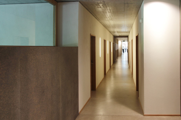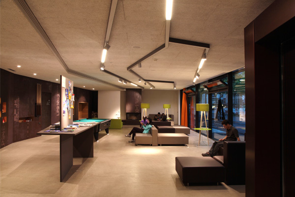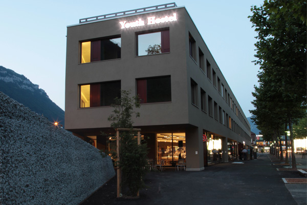 Im Neubau der Jugendherberge am Bahnhof Interlakenbildet der grosszügige Restaurant- und Loungebereich im Erdgeschoss das kommunikative Zentrum. Aus den Aspekten Vernetzung der internationalen Gäste und der Lage unmittelbar am Bahnhof entstand eine Lichtskulptur, die sich an der Decke über den gesamten offenen Raum entwickelt. Tagsüber wird das einfallende Tageslicht durch diffus abstrahlende Lichteinsätze unterstützt, in den Abend- und Nachtstunden wandelt sich die Atmosphäre: Die Akzentbeleuchtung bildet mit Objektleuchten und in die flankierende Stahlwand eingebaute beleuchtete Ausstellungsfächer eine warme Lichtstimmung. Die Korridore in den Obergeschossen werden durch die Passanten belebt. Einseitig in den Wänden eingebaute Lichtlinien werfen ein weiches Schattenspiel auf die gegenüberliegende Wand.