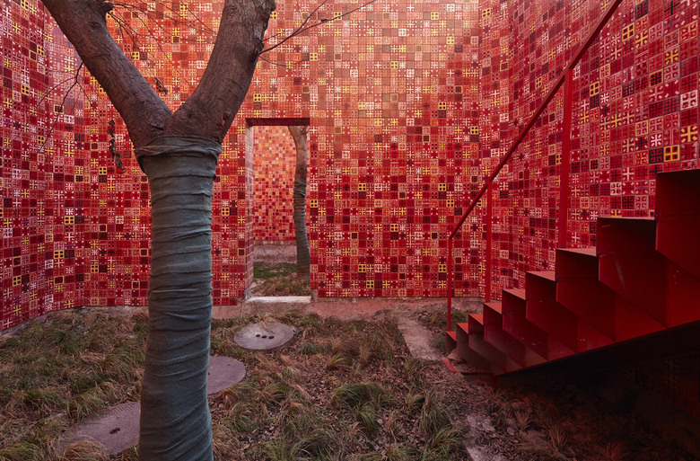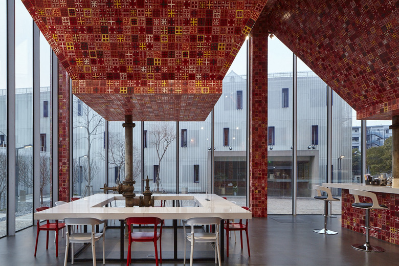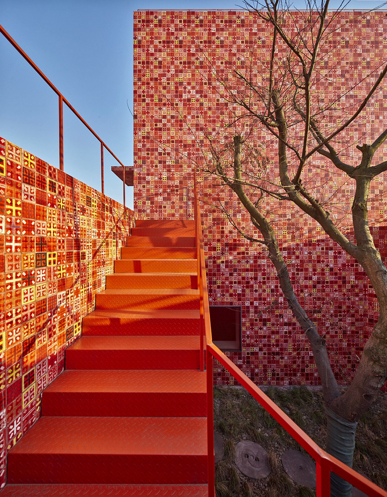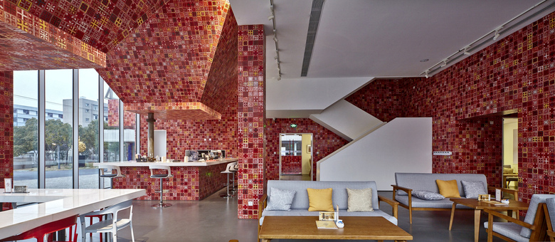 base on his own drawing style, witch to be used as the primary decorative material for facade with the design purpose of adding a new layer of significance on existing industrial construction. The design reserves the original sewage bucket funnel, which partly be designed as functional form feature for ground floor Cafe, and partly be transformed as courtyard in the upper space. The original sewage channel be treat as the rain water drain device to be present in the interior of Cafe. By design through the implanted new functions such as Cafe, Bookstore and Art Exhibition Hall to transform the original sewage treatment station into a new art space. The colorized crisscross pattern ceramic tiles designed by artist Dingyi has enhanced this construction’s artistic atmosphere, while the original information about industrial construction doesn’t lose.