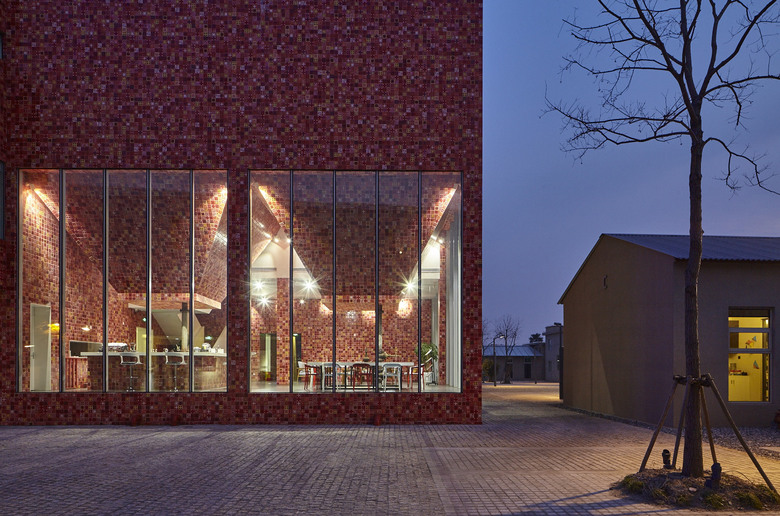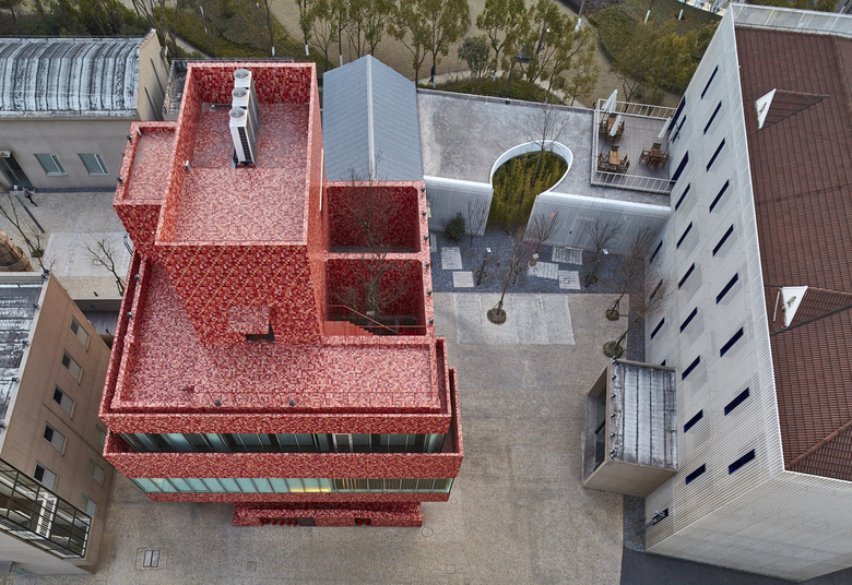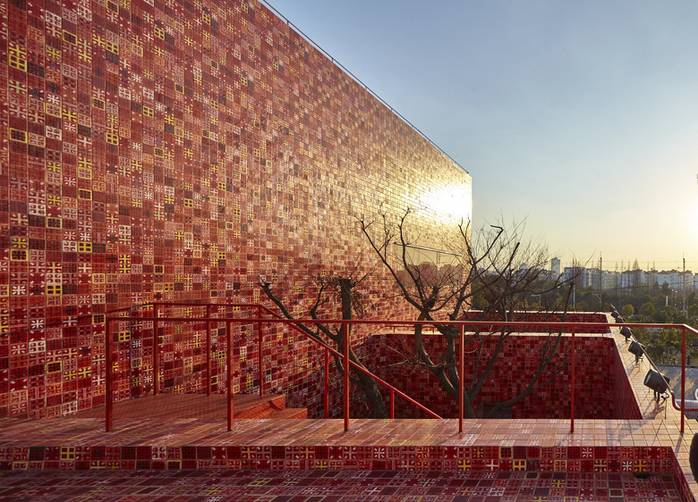 Within the Arts Centre, “Dingyi Biulding” is visual core of the whole district, which is designed by the cooperation with artist Dingyi, and transformed from sewage treatment station of original towel factory in result of obtaining the functional form feature. Architect recommend artist to design ceramic tile with different color scheme