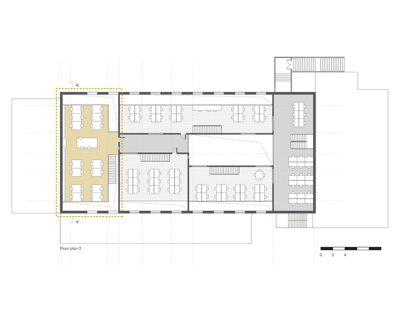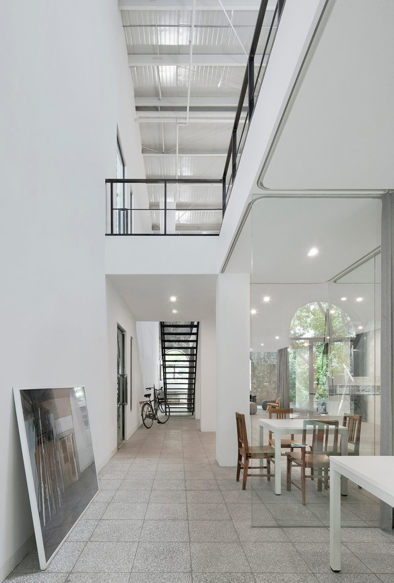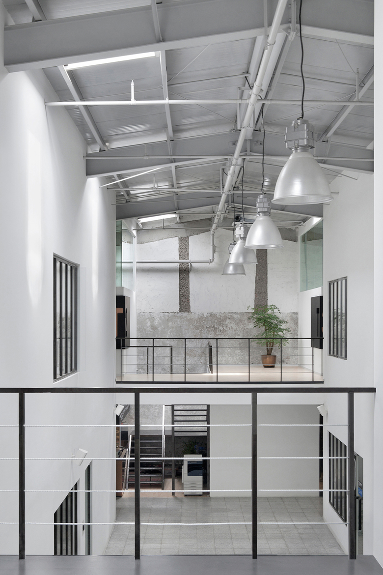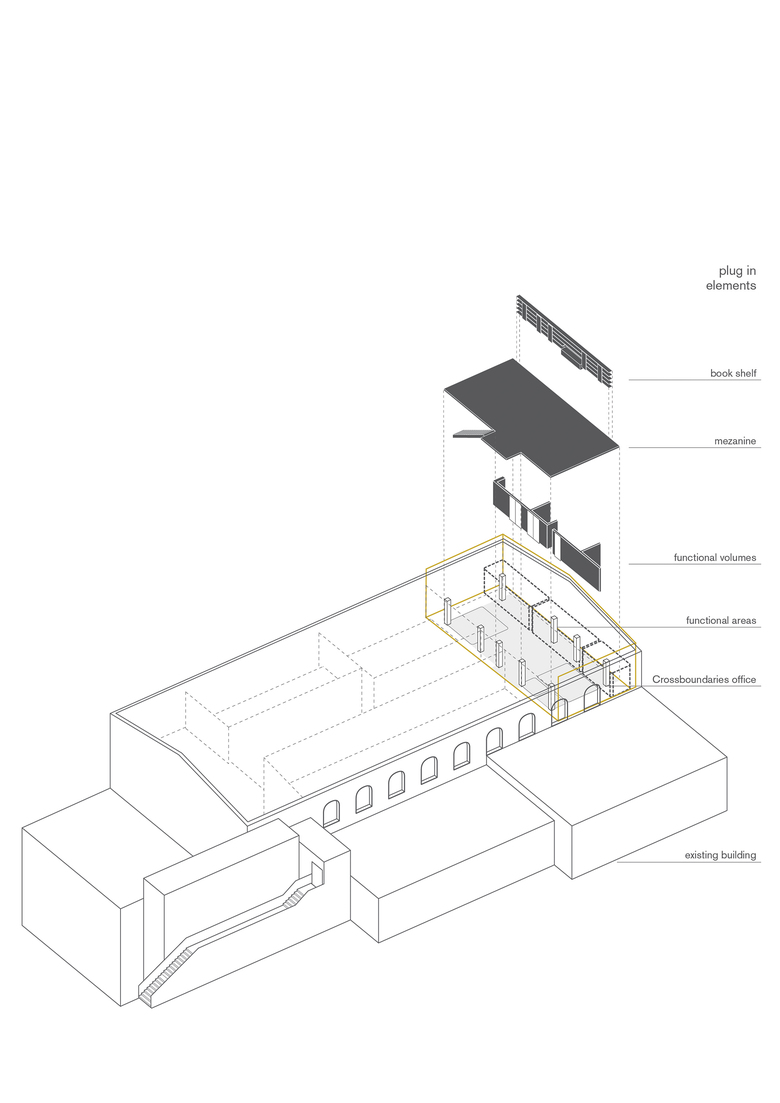 Crossboundaries occupies one of the four created offices. The office is sitting under a new roof, evenly scattered with skylights, raised to allow space for a mezzanine level in the newprogram. The existing walls left bare, expose its past and new transformation, revealinga glimpse of the building's history hailing from the 50s.