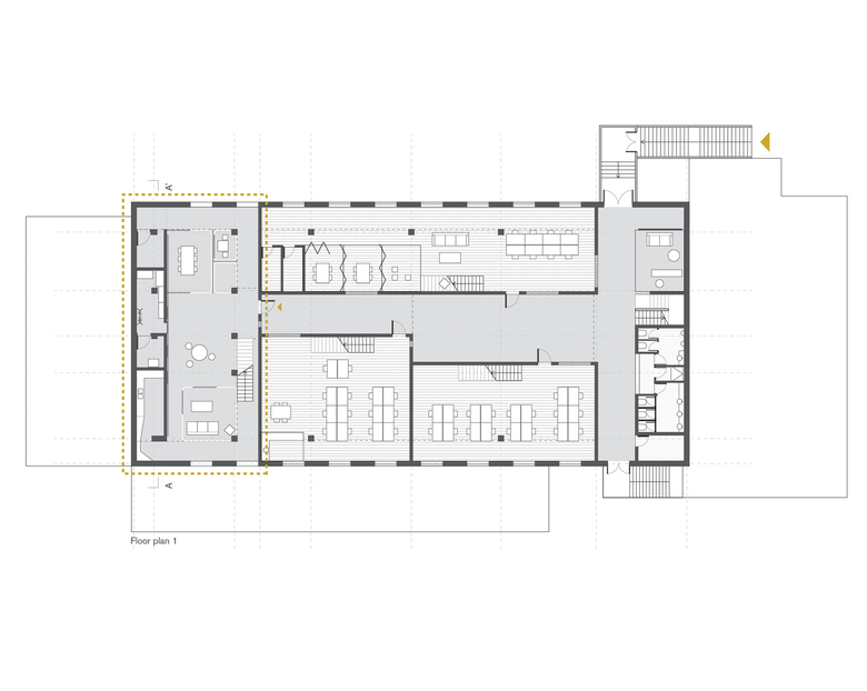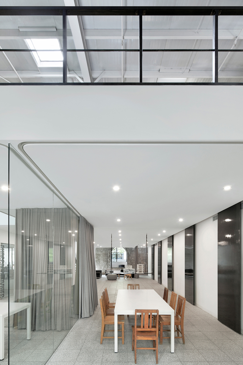 Inside Crossboundaries office, the principal floor is an open meeting area. A service stripewith a pantry, storage room and a small meeting roomruns parallel across the back of the office layered with movable pin boards. Above, the mezzanine is for working, the service stripe is here accommodating the material and reference library.