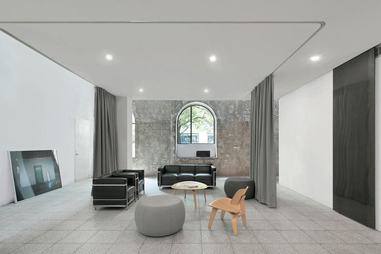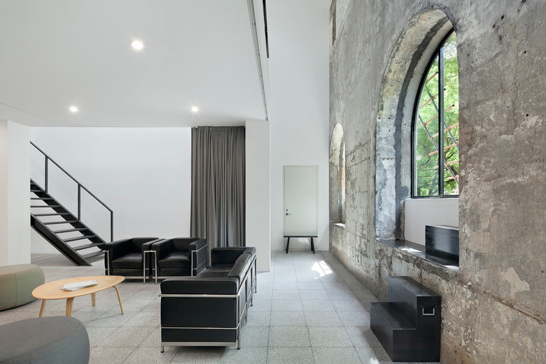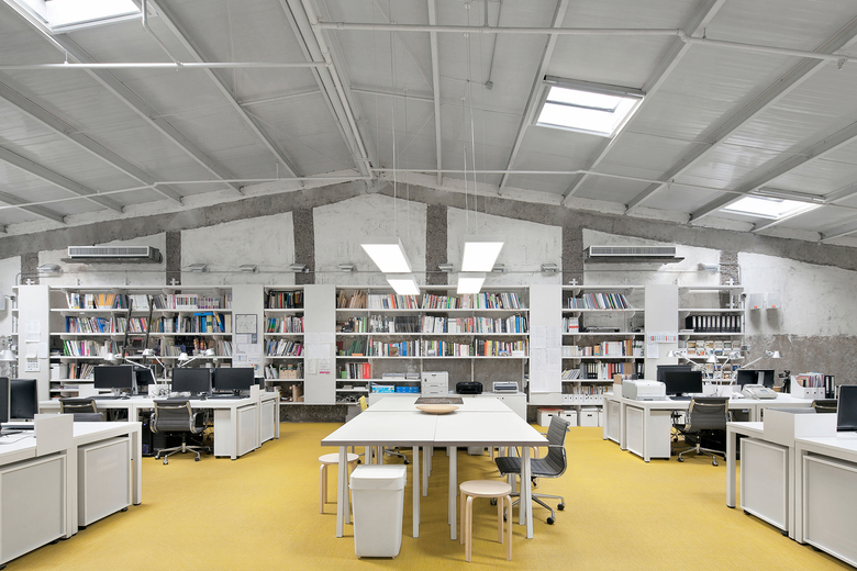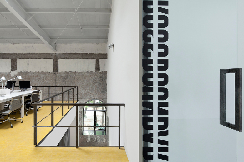 A former auditorium is transformed into lofty contemporary workspaces. Centered around an atrium,windows open into four offices spaces, extending the sense of the open floor plan. Insidemezzanine floors form voids with the original outer walls for circulation, air and light filtering from the skylights.