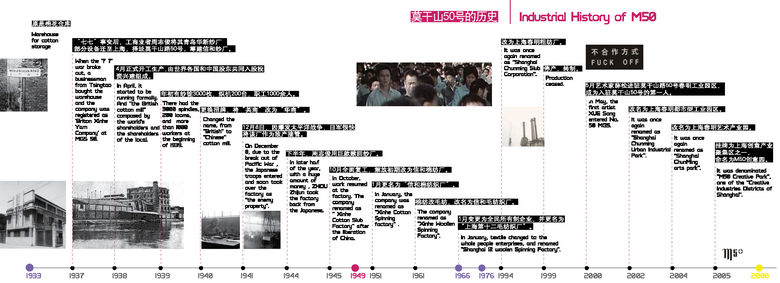 The national textile factory which has the brilliance history more than 70 years, located in Moganshan Road 50, is one of the so little survivals during the modern urbanism's crisis. After the entering of avant-courier artists and culture institutions since 2000, the factory is becoming an important and influenced artist's enclave in the urban landscape. And following its renaming M50 has been growing as one of the leading creative parks since 2005 in China and Asia.