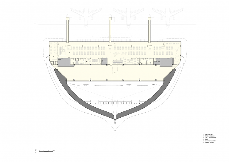 Below the terminal, a sunken parking structure follows the natural terrain. A landscaped central promenade runs beneath the building, guiding passengers intuitively towards the departure hall and resolving the challenges posed by the mountainous site through architectural continuity rather than separation.