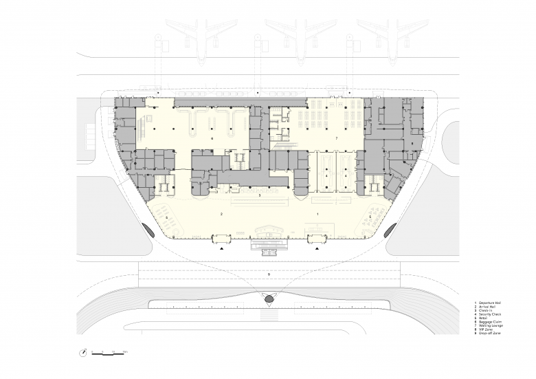 The terminal is organized around a one-and-a-half-story sectional strategy, anchored by a double height entrance hall that links the ground floor arrival spaces with the upper-level departure lounge. This compact vertical organization streamlines passenger circulation while maintaining visual continuity across levels.