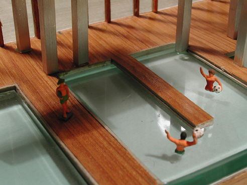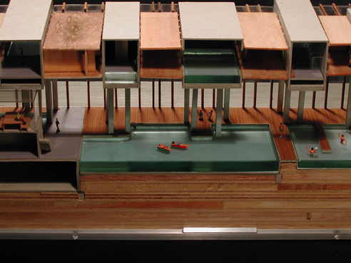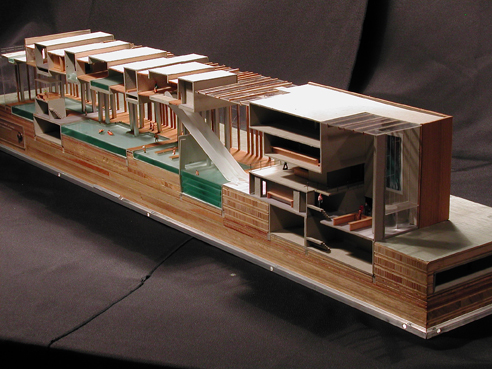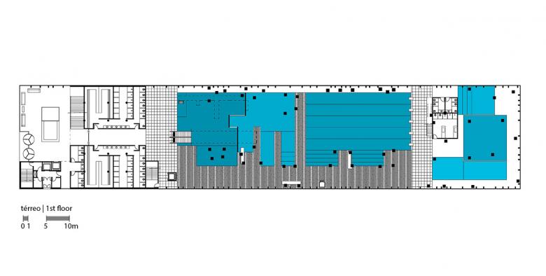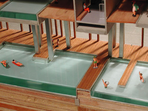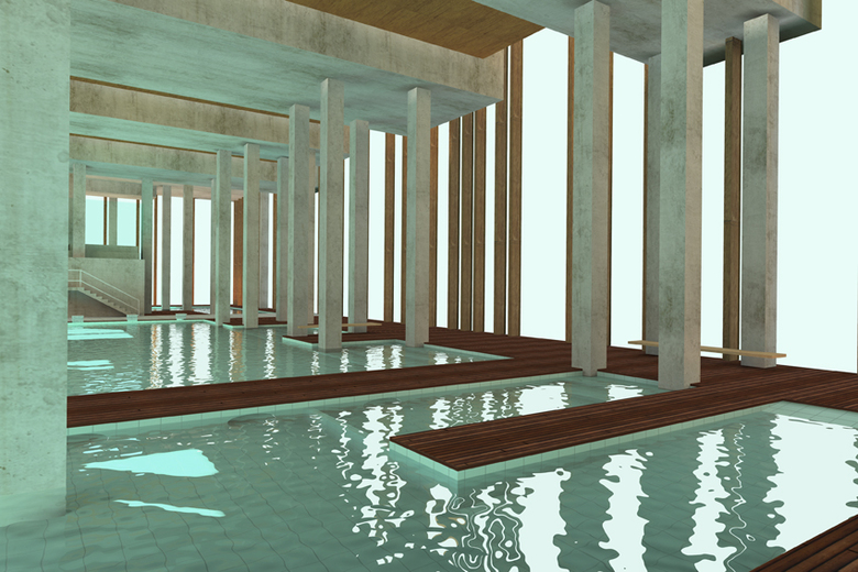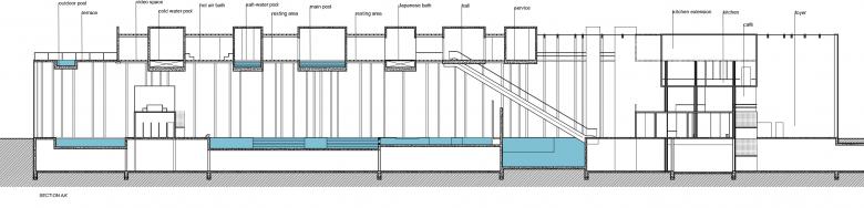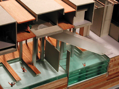 In the small town Aalborg, north of Denmark, an international competition called up for an architectural design that gathers a spa and some swimming facilities within the same building. The spa’s swimming pools are sheltered in huge suspended concrete boxes; and its structure, born inside the public pools located downstairs, are linked by levelled wooden decks.