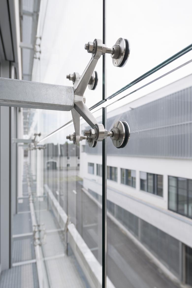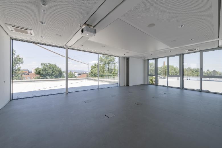 Der 3-geschossige Baukörper ist als Bürogebäude mit innenliegendem Atrium und zentraler Eingangshalle bzw. Erschließung entworfen. Somit ist eine flexible Grundrissfi guration mit natürlicher Belichtung gewährleistet. Das Erdgeschoss ist bewusst zurückgesetzt und trägt zwei auskragende Obergeschosse, die somit als schwebender, ringförmiger, horizontal gegliederter Baukörper erscheinen. Eine multifunktionale Zone als 4. Geschoss, parallel zur Strasse auskragend gestaltet, was die Bedeutung dieses Geschosses hervorhebt, ergänzt das Headquarter.