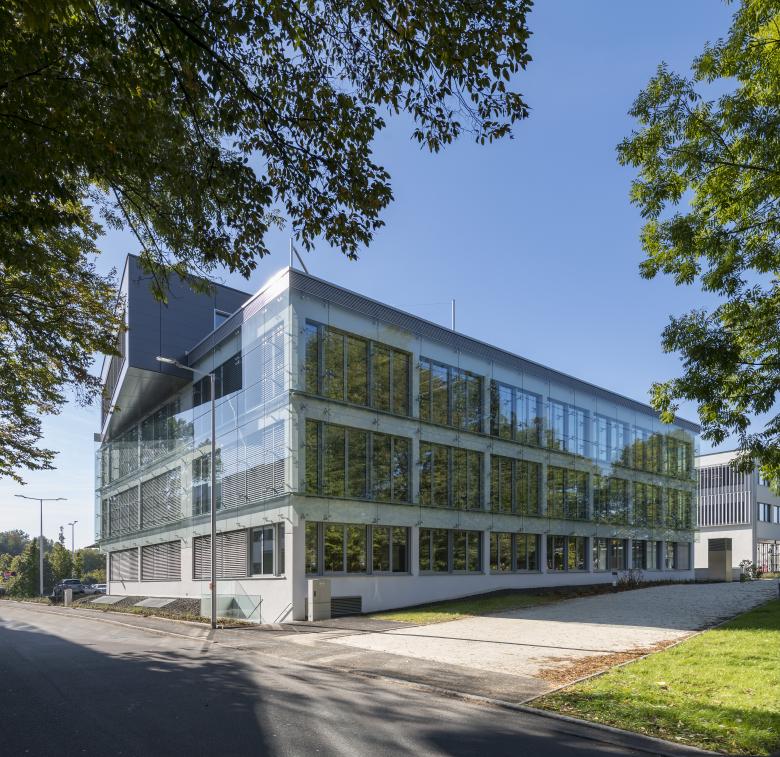 Der horizontal gegliederte Baukörper transportiert gestalterisch die Idee von „gestapeltem“ Papier, was eine symbolische Anlehnung an die Produkte der Nutzer ist. Das Atrium bildet einen Orientierungspunkt und die grüne