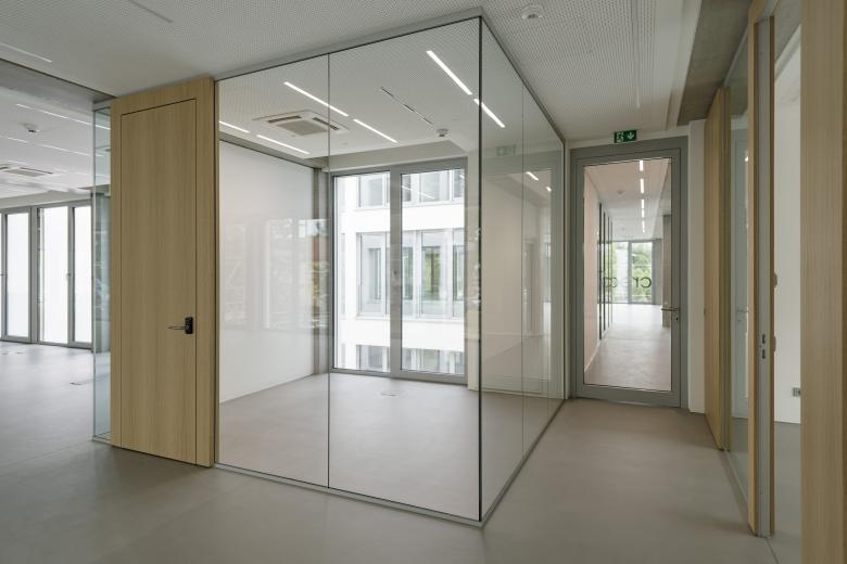 Mitte des Gebäudes, was in Kombination mit der Doppelfassade und den Dachterrassen zu einer angenehmen, exklusiven und inspirierenden Arbeitsumgebung führt.