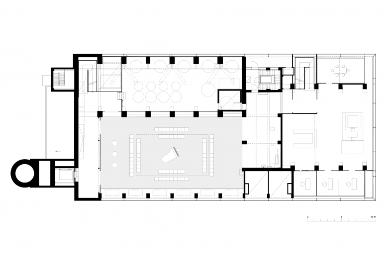 Die historischen Funktionsabläufe werden herangezogen und die ursprünglichen Räume genau analysiert. Auf dieser Grundlage werden im Erdgeschoss und im 1.Obergeschoss nicht ursprüngliche Einbauten rückgebaut und die grosszügigen Räume wiederhergestellt. Um die Entfluchtung des neuen Veranstaltungssaal zu gewährleisten werden 2 neue Erschliessungskerne errichtet. Diese werden auch in der bestehenden Erschliessungsachse angeordnet um die Orientierung im Gebäude zu vereinfachen.