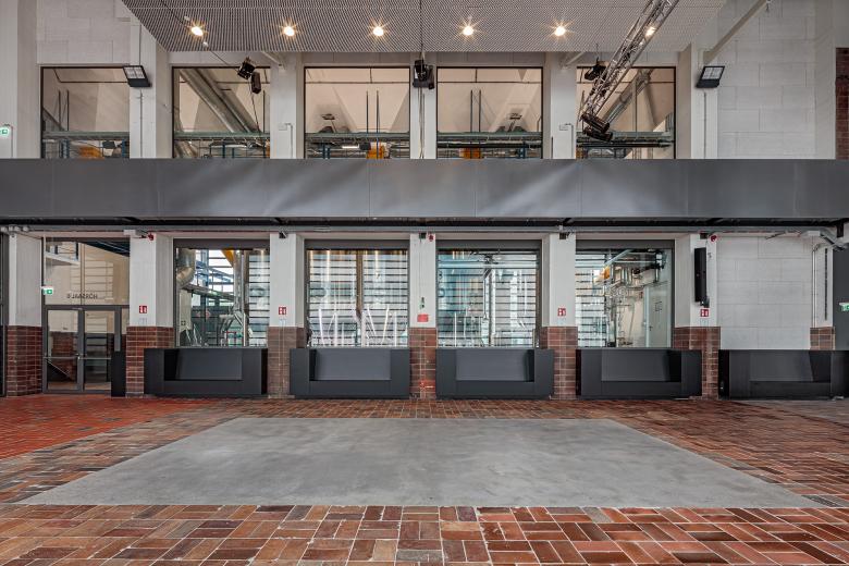 Räumlich werden die Funktionen transparent abgetrennt, um das ehemalige Kesselhaus in seiner beeindruckenden Dimension und voller Höhe erlebbar beizubehalten. Eine frei im Raum gestaltete Decke, die zum Heizen und Kühlen des Saales dient, bildet ein neues Raumzentrum. Dieses wird mit Beleuchtung inszeniert und spiegelnde Oberflächen lassen das Gebäude von innen nach aussen strahlen.