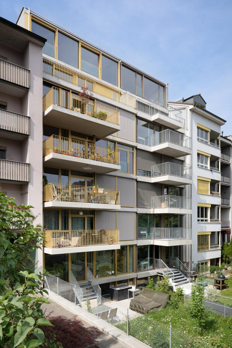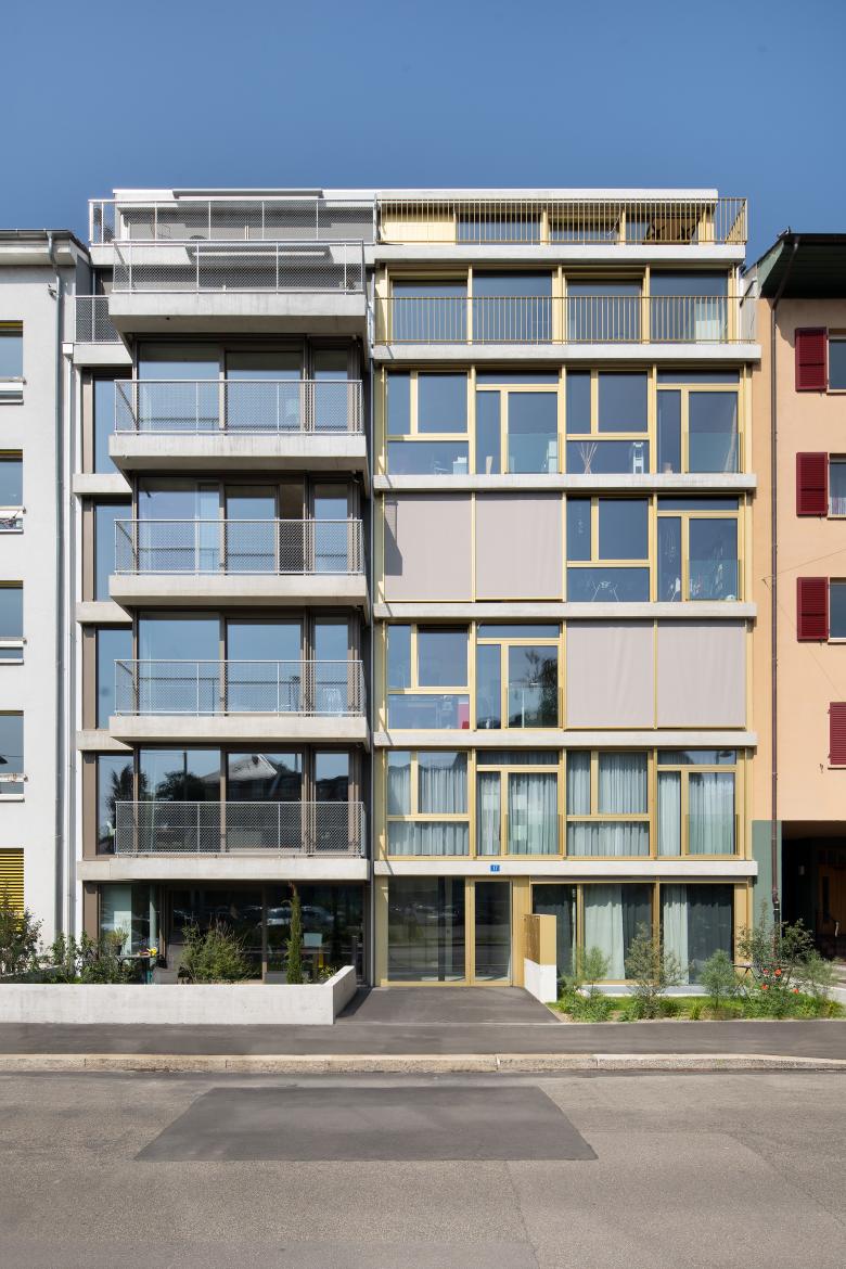 Gebäudehälfte mit goldiger Fensterrahmenfarbe: