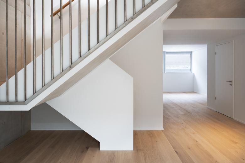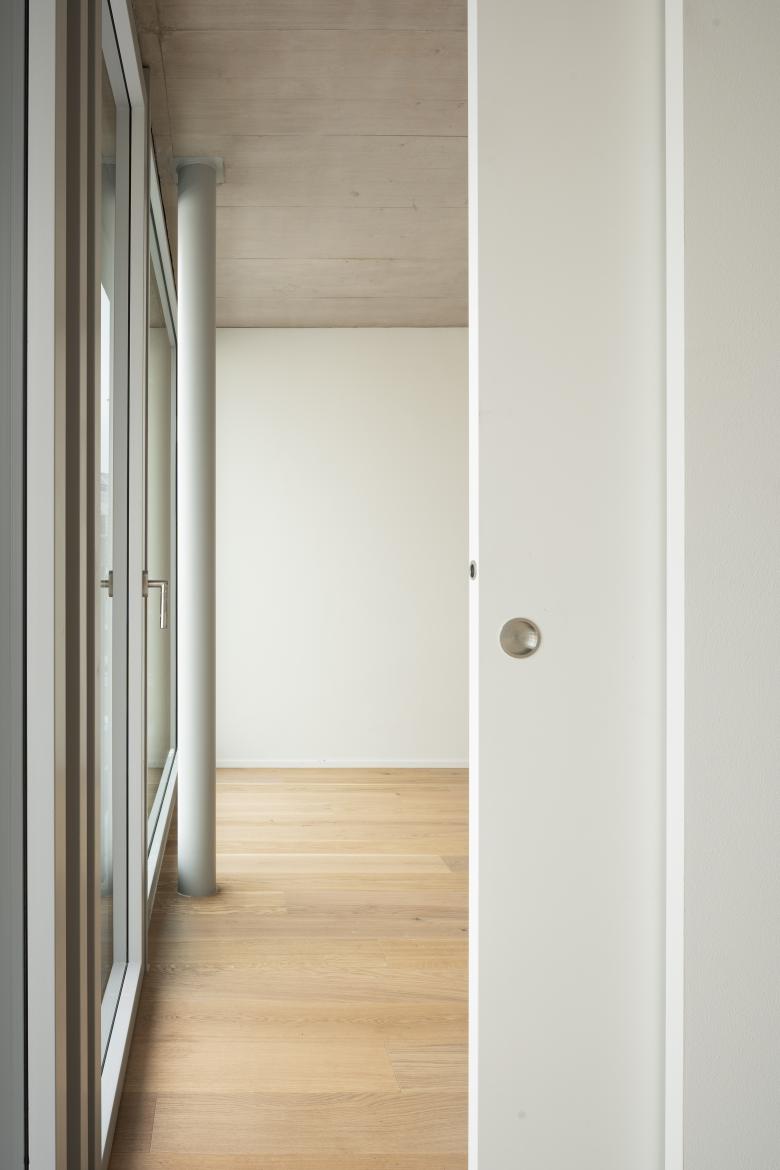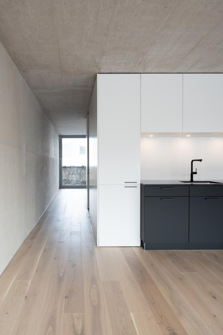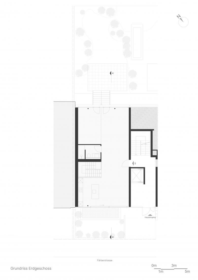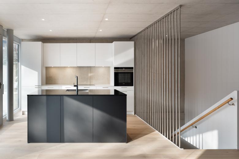 Gebäudehälfte mit dunkler Fensterrahmenfarbe: