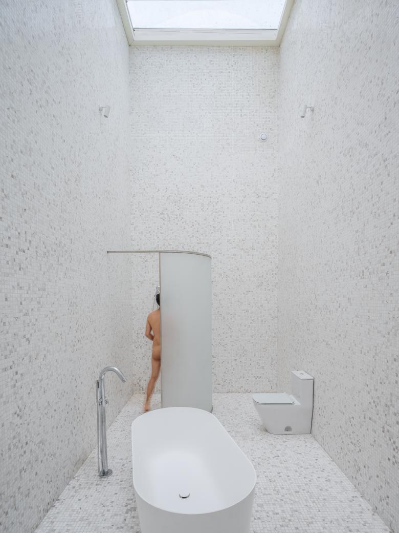 The space in the upper floor glass house is simultaneously open and divided. The inhabitant may move along the outer glass curtain wall enjoying a panoramic view of the surrounding water court, which is only punctured by the sceneries through the cuts in the peripheral wall.