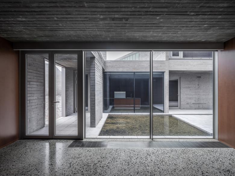 Reinforced concrete is used like clay to mold pure spaces. The textured surface of the exposed concrete poured in timber formwork is intended to avoid abstraction and give expression of tangibility to the spaces.