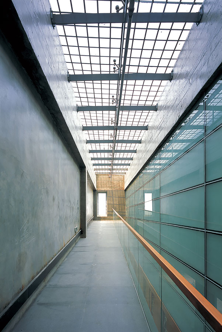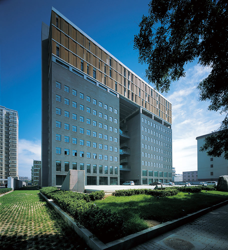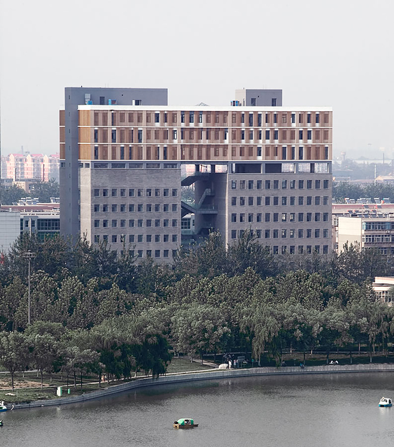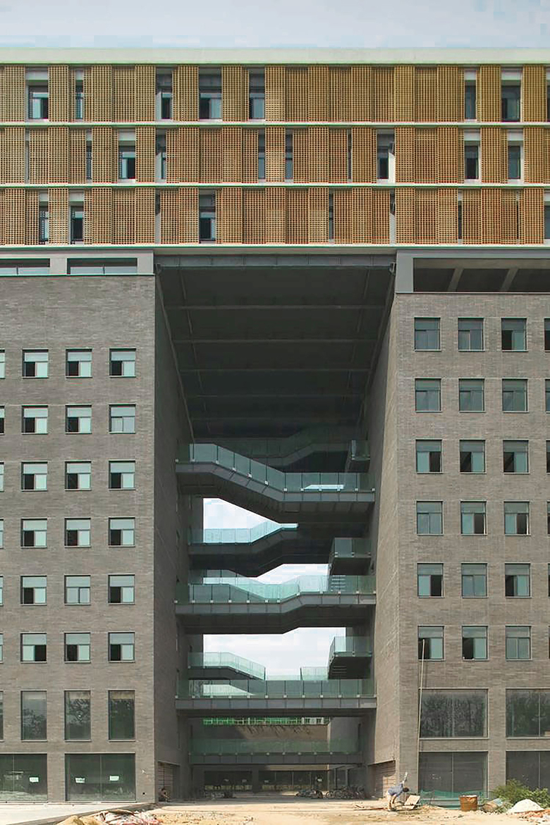 The publishing house itself needs only three stories of space. Yet the lively real estate market in China and the high cost of land have driven the company to construct a twelve-story building and develop rental office space, conference and exhibition facilities, a hotel, restaurant, café, bookstore—even an art museum and an indoor basketball court. This hybrid use inspires and informs the architectural design: The structure is thus dissolved into three relatively independent micro-buildings. The publishing house is located on the top floor, with rental office space and commercial activities below. The spaces between the micro-buildings are open to the public and form a vertical urban garden while also serving as a fire escape. This very urban quality of the in between space pushes the edifice towards a miniature city.