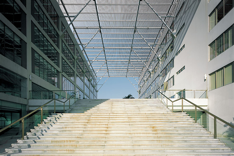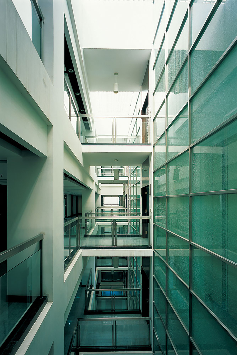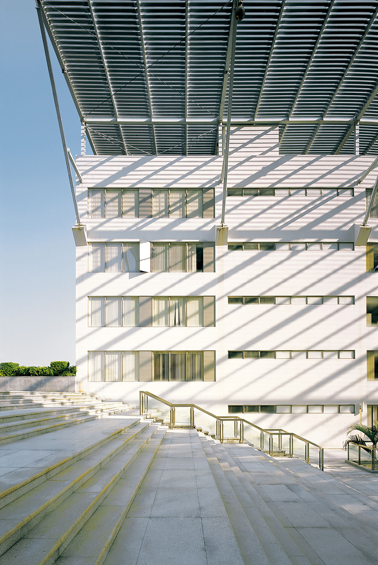 Shipai is one of the thirty-three townships of Dongguan City in the Pearl River Delta area, which is known for its heat and humidity. The town’s administrative center design responds to local weather conditions to achieve a regional architectural quality of a sort that has faded greatly with the introduction of air conditioning in the 1980s. The building is sliced east–west into three thin layers for better natural ventilation. The frame-colonnade on the south side functions as a sun-shading device while creating an appropriate governmental image. The horizontal louvers over the complex are to reduce heat gain on the roof as well as to define public spaces between the layers.