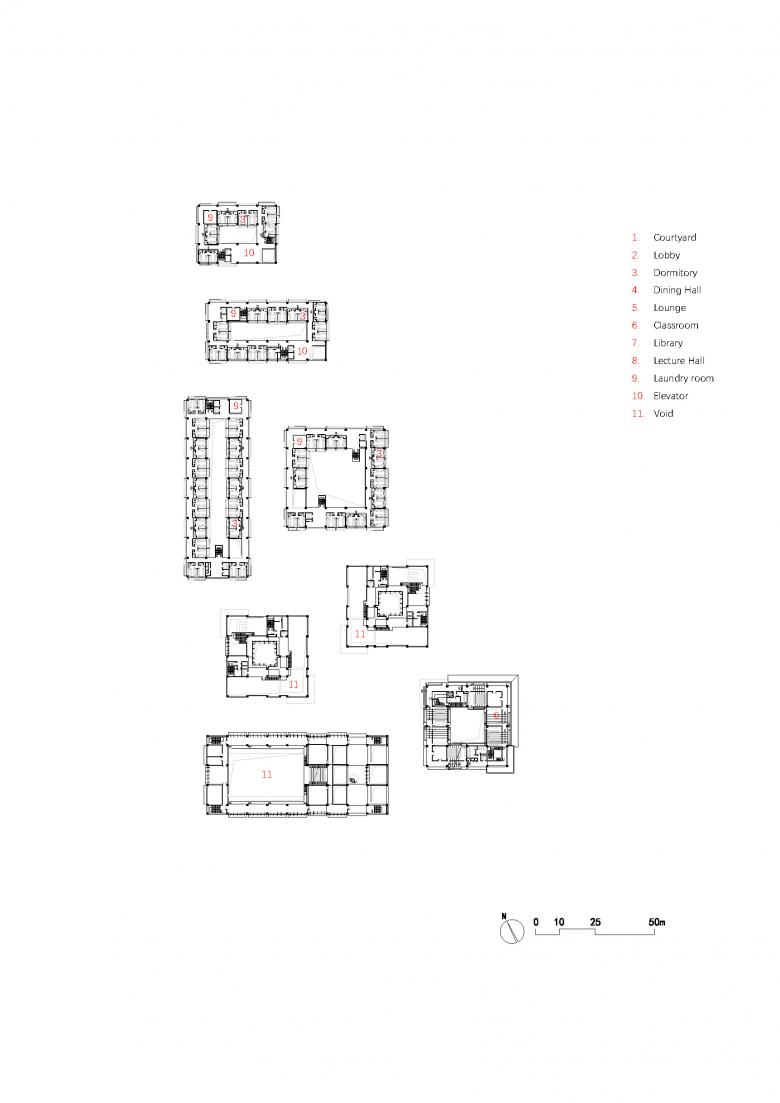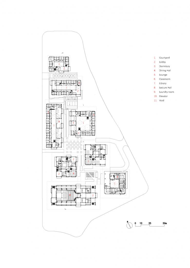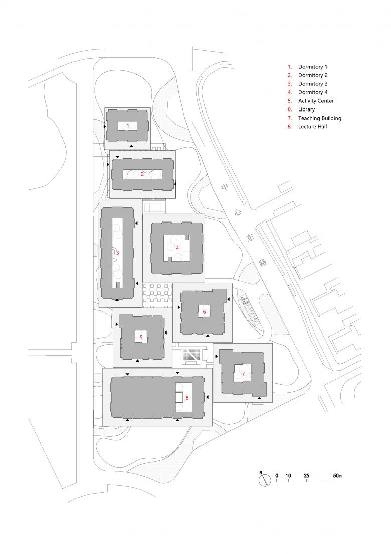 Wenzhou, a city that has a name hinting at a mild climate. This prompted us to imagine a more intimate connection between people and nature, emphasizing more outdoor activities and living specifically. The climatic context became the genesis for conceptualizing the Wenzhou Medical University International Exchange Center. The specific site, embraced by continuous tree canopies, makes a pleasing landscape. To push the notion of harmonizing architecture with nature, our foremost approach involved disassembling the content-rich exchange center into a unity of eight 4-story buildings. Each of these structures is dedicated to a specific purpose: Dormitories (4 blocks), Activity Center, Library, Teaching Building and Lecture Hall.
