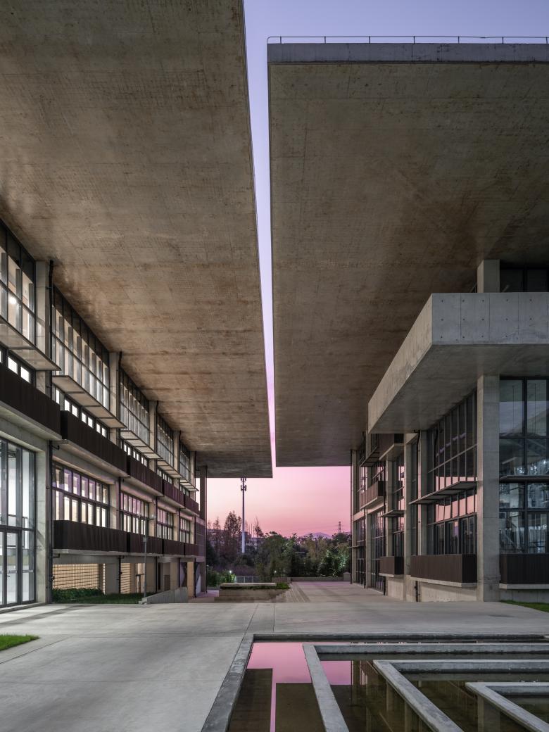 Subsequently, the typically closed-up building is broken, turning into a four-layered spatial arrangement from the center to the periphery: the central courtyard (outdoor), the air-conditioned zone (indoor), the veranda (semi-indoor), and the area under the overhang (semi-outdoor). The latter two layers serve as transitions between indoor and outdoor spaces, constituting a Gray Space. Shaded by projecting roofs and inheriting the traditional deep eaves from Chinese timber architecture, each building adopts an umbrella-inspired section with a 10m deep cantilever. The roofs of the entire complex are thus joined into an abstract continuous "tree canopy" by aligning the eaves of the eight structures on the same plane. This canopy is only disrupted by three large courtyards - two enclosed on four sides and one on three – and with 50cm wide gaps between the 8 small-courtyard-punctured individual buildings. The 50cm wide "sky slit" admits sunlight or rainwater into the Gray Space, crafting a landscape that blends architectural and natural elements. The veranda space takes the shape of a series of open rooms, shielded from the weather by the deep eaves.