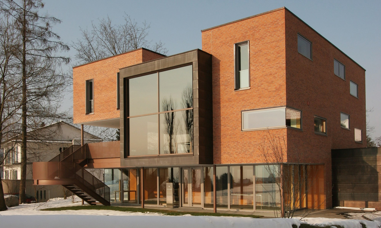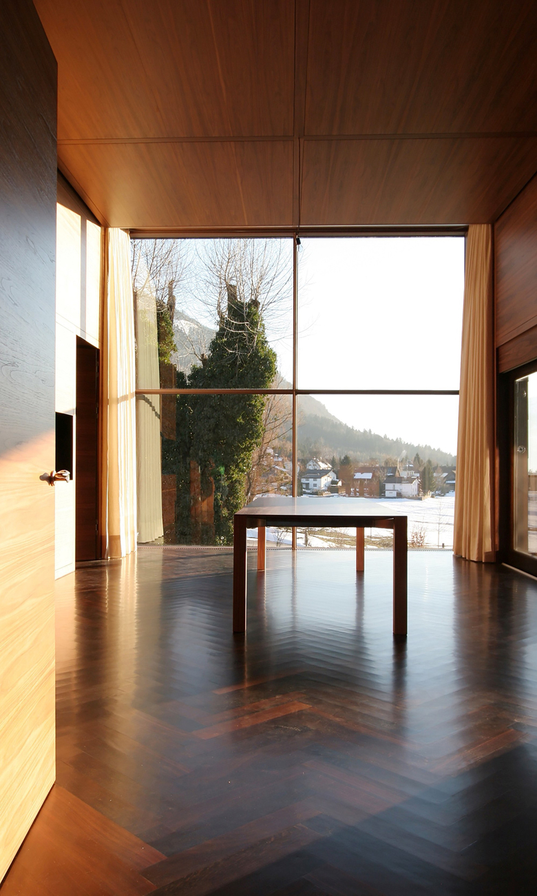 Die Anordnung des Einfamilienhauses auf dem hügeligen, parkähnlichen Areal wurde vom vorhandenen Gelände und dem Baumbestand bestimmt. Das natürliche Farbenspiel der Klinkerfassade, dem patinierten Kupfer und der zurückhaltenden Formensprache bilden den idealen Übergang vom Wohngebiet zum Naturraum. Die Casa Gallmist stellt eine dreigeschossige Villa in Massivbauweise dar. Der Zugang erfolgt über einen vorgelagerten „Aromagarten“. Neben den dezenten Farbtönen der verwendeten Materialien bildet ein großes Aussichtsfenster das zentrale Element des Projektes.