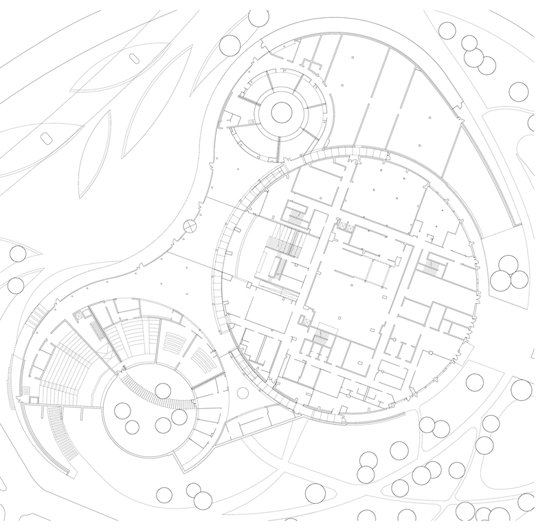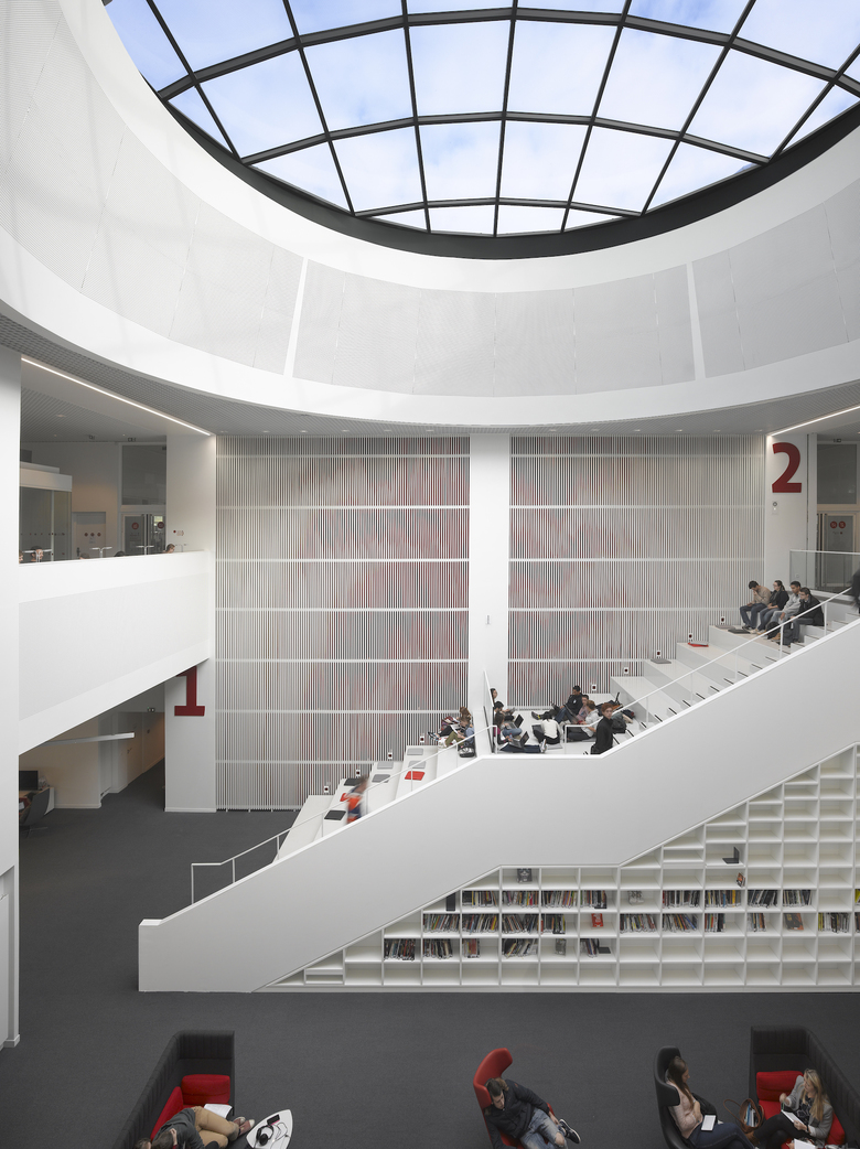 Das bestehende Bibliotheksgebäude mit seiner prägnanten, netzartig aufgelösten Betonfassade wird um einen Veranstaltungsbereich, eine Cafeteria und ein Experimentarium erweitert. Ein landschaftlich gestaltetes Plateau umfasst den Rundbau und setzt sich von diesem durch eine konzentrische Lichtfuge ab. Unter seinem geschwungenen Dach werden der neue Eingangsbereich und die Erweiterungsflächen angeordnet und über eine große, alle Geschosse umfassende Halle mit dem Bestandsgebäude verbunden. Aus der Bibliothek im klassischen Sinn wird ein modernes „Learning Center“.