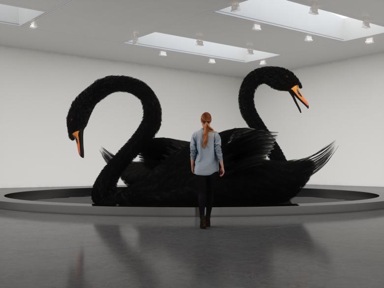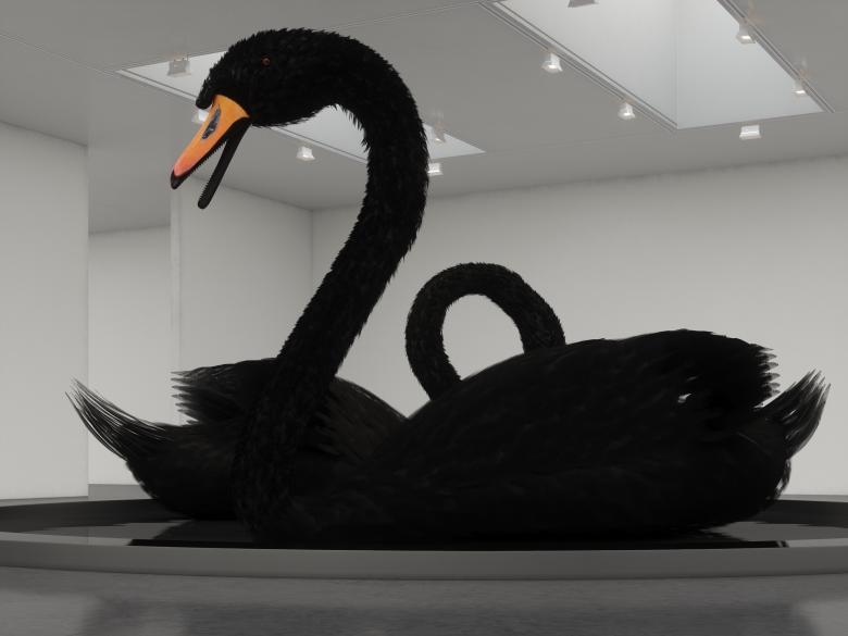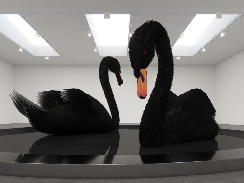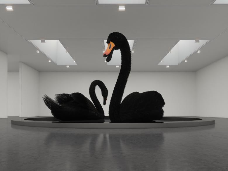 For this installation two giant black swans float in a pool of black oil framed by a ring of polished stainless steel.