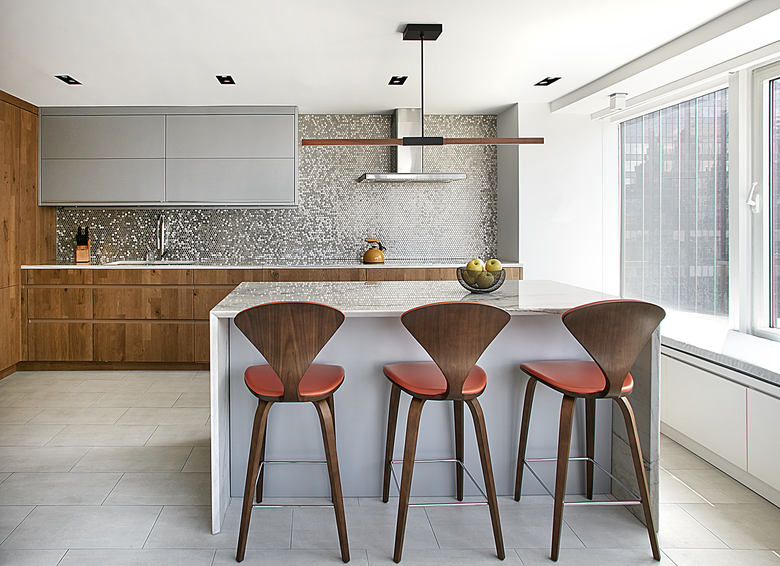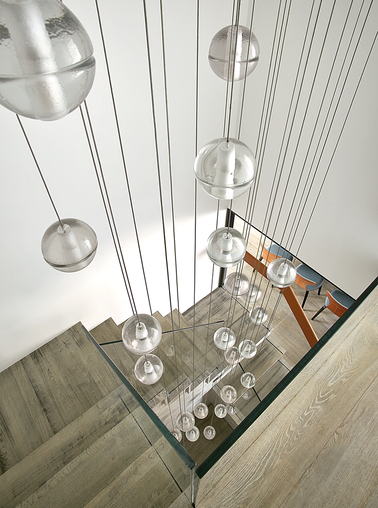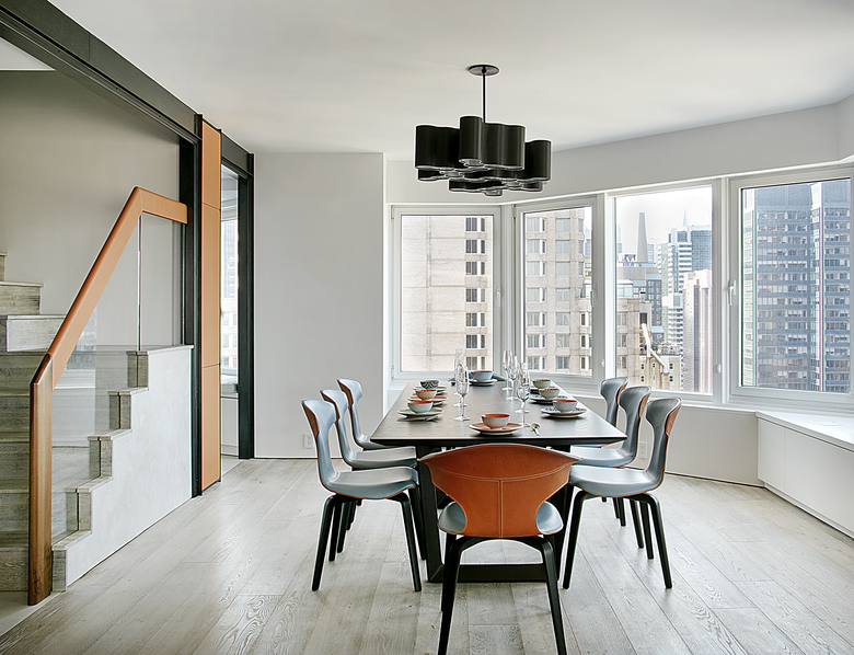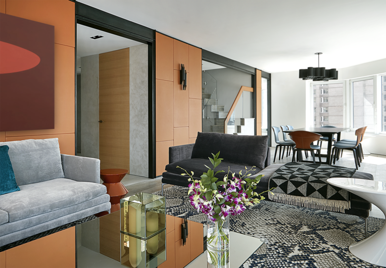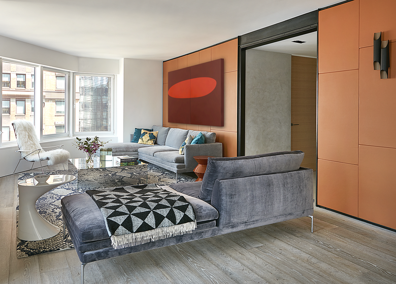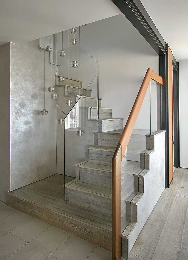 This edgy, yet sophisticated interior is located on the 39th and 40th floors of one of the tallest mixed-use skyscrapers in New York City. Distinguishing the social areas of the household, are beautiful soft leather wall panels, creating a chic backdrop for the elegant furniture, such as the B&B Italia sofa and lounge chair. Leading to the private bedrooms above, the same leather is introduced on the handrail of the dramatic feature staircase.