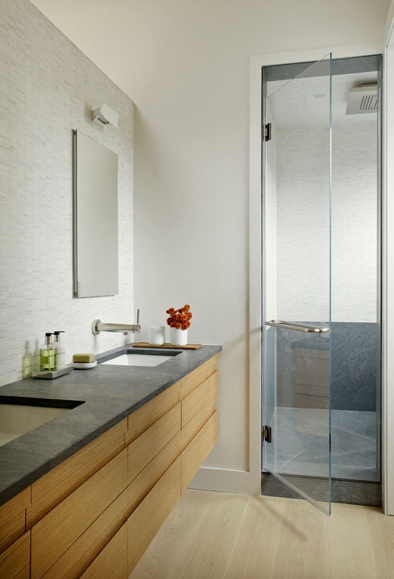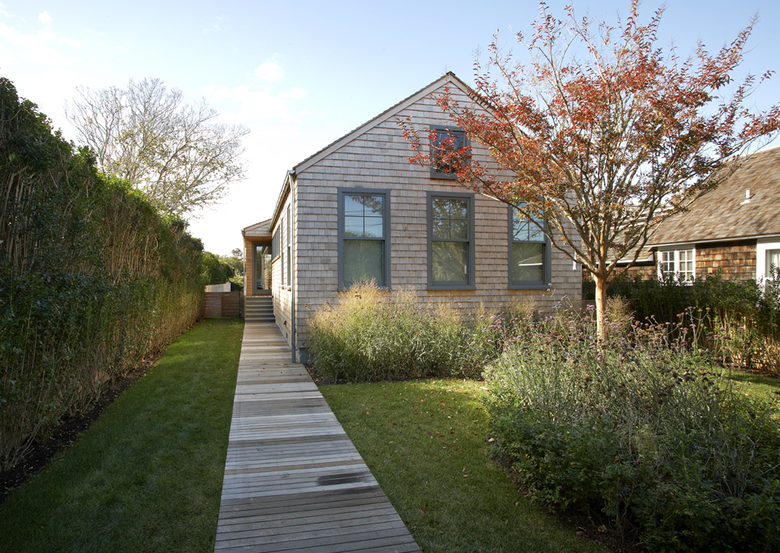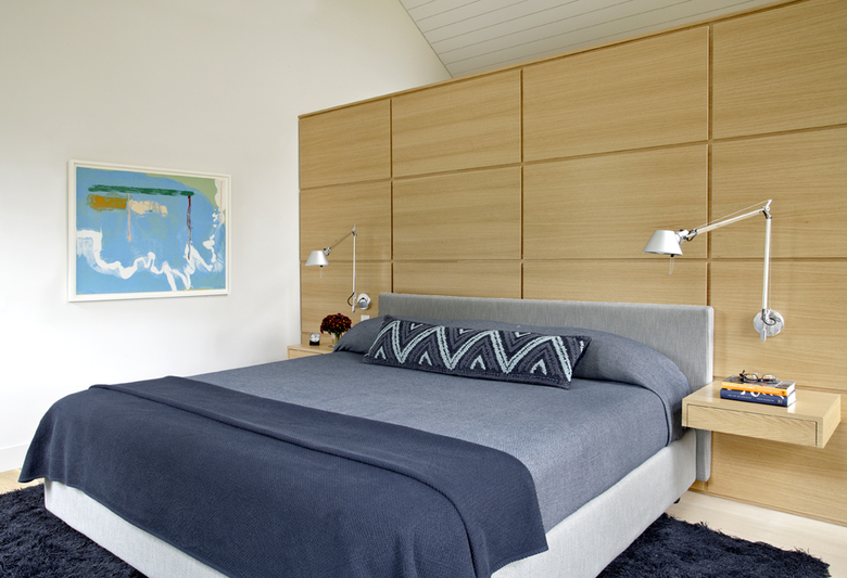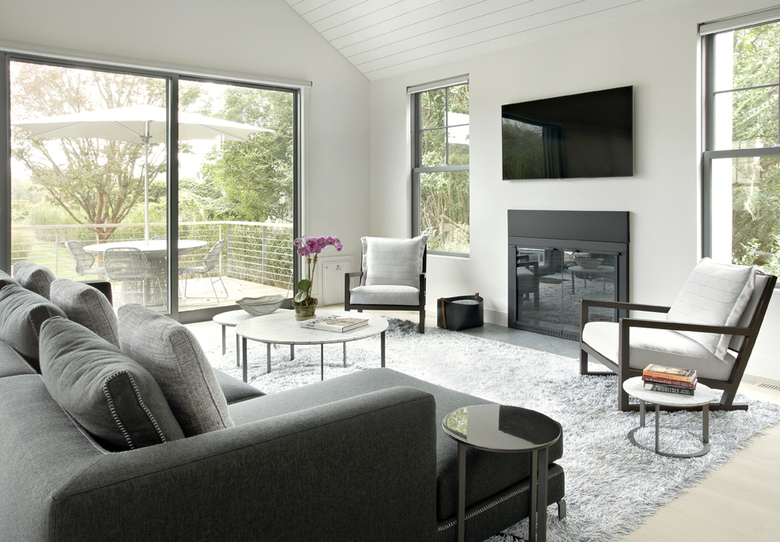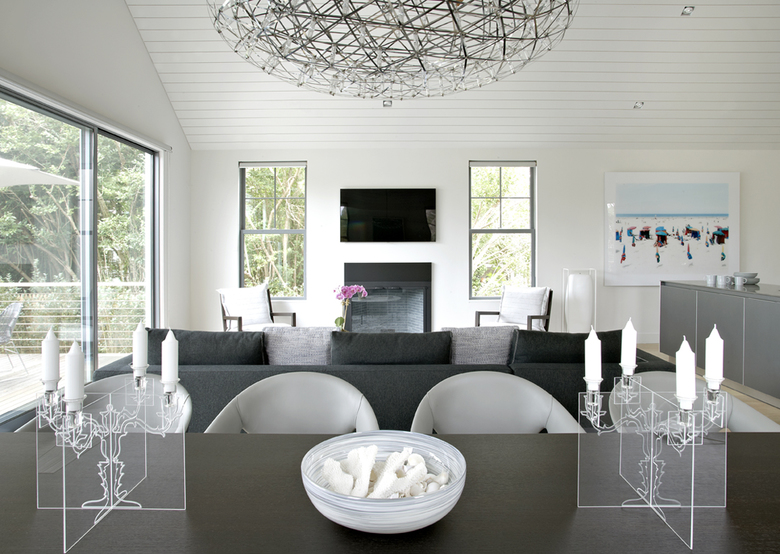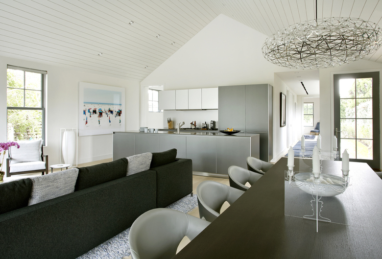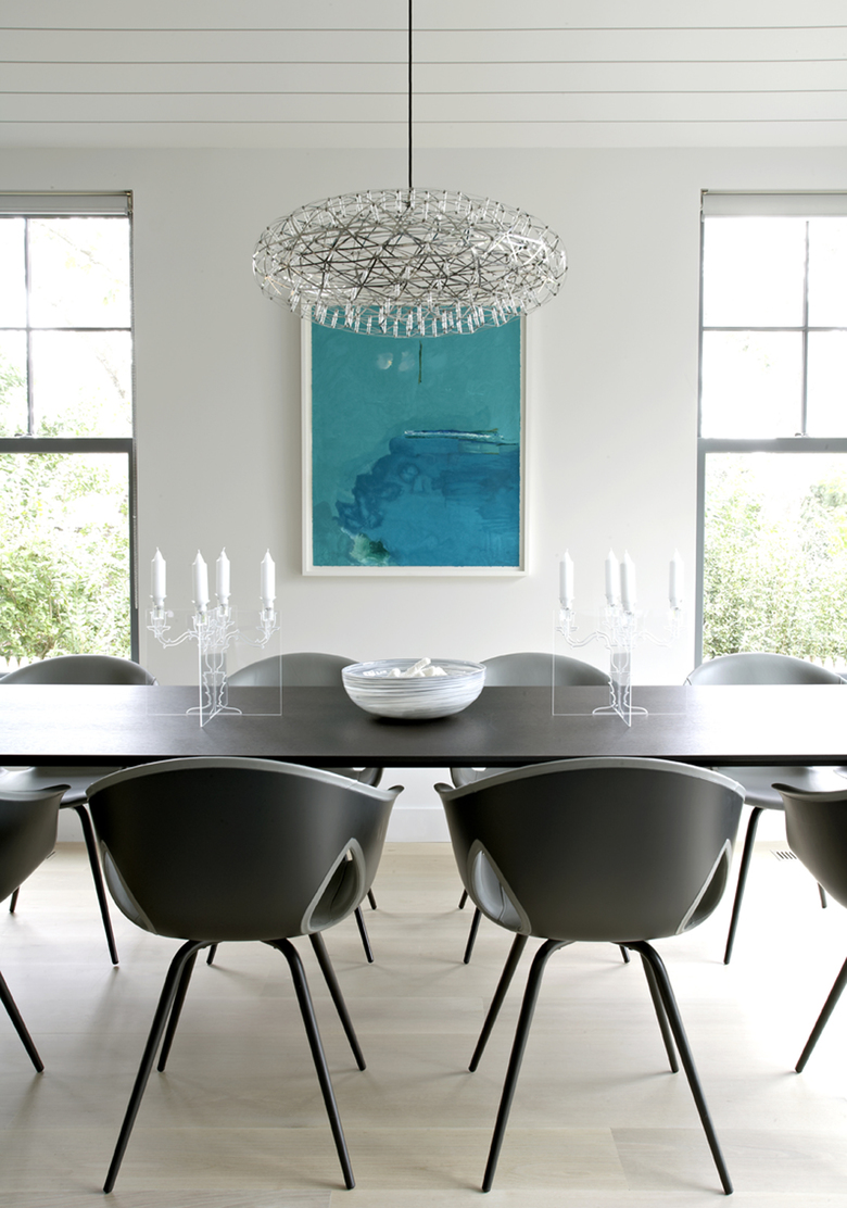 The exterior of what looks like a vernacular Hamptons shingle cottage, designed by architect Blaze Makoid, is intentionally deceiving. For the interiors, Axis Mundi typically decided not to play by the rules. Instead of de rigeur nautical artifacts, floppy sofas and wicker furniture, the firm responded to Makoid’s all-white interior envelope by injecting rooms with comfortable modern elegance that’s more contemporary Cap Ferrat than Eastern Long Island. Clean furniture silhouettes—from Cassina, Poltrona Frau and B&B Italia—a Massimo Vitali beach scene, a Moooi chandelier and industrial finishes (such as the steel of the fireplace surround and the anodized aluminum of a sleek Bulthaup kitchen) spark a creative tension between indoors and out. The gray palette provides a quiet backdrop for the nature outside, except for the master suite, where custom oak panels and blue shades create a reassuring warmth conducive to sleep.