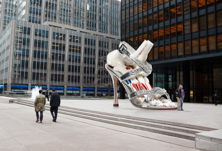 What started as a humorous riff on a podiatrist client’s plastic anatomical foot model becomes a contemporary contemplation on the theme of vanity, which has occupied artists from the Netherlandish painters of the 16th and 17th centuries right through to Marilyn Minter, whose work revels in the seamy, dirty underbelly of the fashion world. The flayed rawness of bones exposes the transience and vulnerability of human existence, which is emphasized by the fact that it is also a cheap plastic simulacrum of the real thing. Slipping this ugliness into a glamorous stiletto with rhinestone-encrusted silver straps spotlights how futile—and in this case painfully deforming—are our attempts to dress up the inescapable truth. This glitz-over-guts sculpture is as barbed as it is humorous.