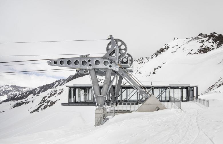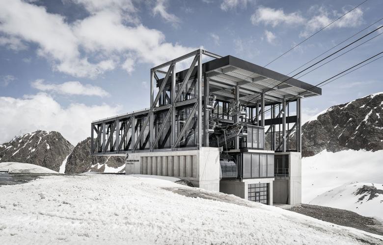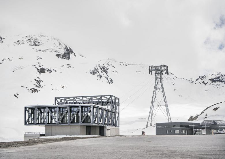 einen hohen Beitrag die Baumaßnahmen vor Ort gering und somit in einem ökologisch vertretbaren Ausmaß zu halten. Basis aller gestalterischer Überlegungen waren die notwendigen, sichtbaren technischen Anlagen der Seilbahntechnik wie Antriebe, Seilbahnstützen und Seilverankerungen. Diese bildprägenden Elemente waren Anlass zur materiellen Reduktion in Beton, Stahl und Glas und formen die technoid wirkenden Infrastrukturbauwerke.