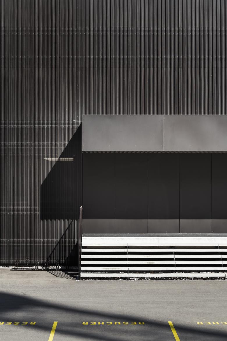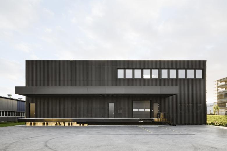 Das kompakt gehaltene Gebäude setzt sich aus dem Stahlbau der Lagerhalle und einem angrenzenden Massivbau in Sichtbetonqualität zusammen. Umhüllt werden diese von einer profilierten, perforierten Metallfassade in homogener dunkelbrauner Farbgebung. Die Eingangsfront mit ihrem großzügigen Treppenaufgang zeigt sich geschlossen mit durchscheinenden Fensterflächen. Markante Vordächer auf drei Gebäudeseiten strukturieren die Erscheinung des Baukörpers. Das Atrium im Obergeschoss bringt Licht und Luft in das Gebäude, schafft spannende Blickbezüge und bietet gemeinsam mit der hochwertigen Materialisierung der offenen Büroräume eine attraktive Aufenthaltsqualität.