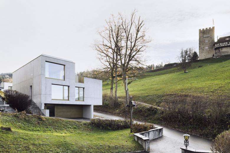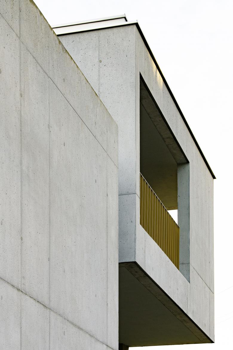 Am Rande eines Einfamilienhausquartiersbefindet sich ein neu abgespaltenes Grundstück an leichter Hanglage. Dieses wurde mit einem dreigeschossigen Sichtbetongebäude überbaut. Die Erschließung erfolgt über einen gegen Westen orientierten Eingangsbereich im Untergeschoss. Auf der nächsthöheren Etage findet das private Leben mit Schlafzimmern und dazugehörigen Nasszellen statt. Den zwei Kinderzimmern vorgelagert, kommt ein kleiner, überdeckter Außenraum zu liegen, welcher eine Filterfunktion zur Straße übernimmt.