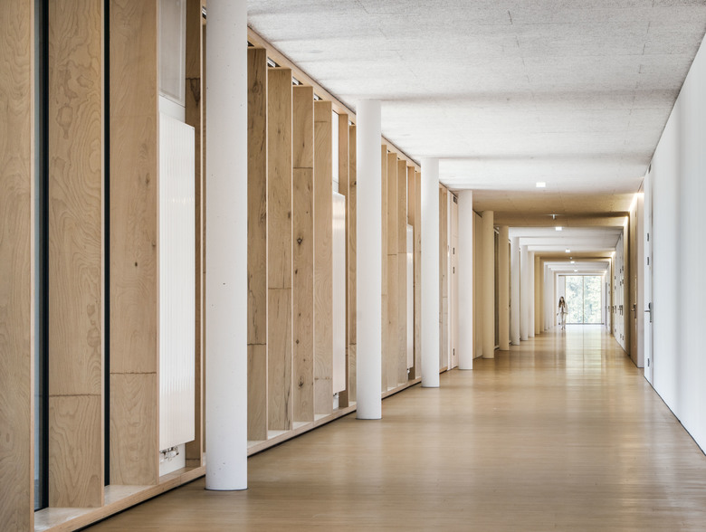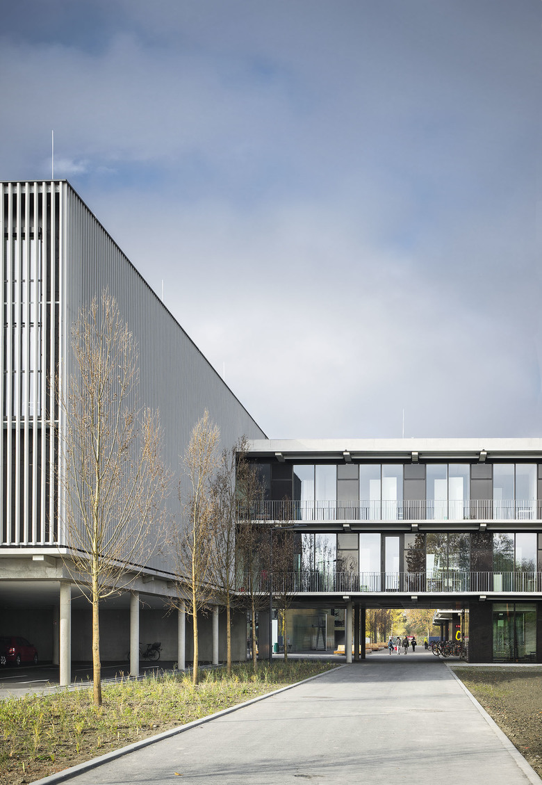 Lagequalitäten Die außerordentliche Lage der neuen Schule, also ihre Nähe zum See und der unverbaute Blick zum Seeufer, führen zu einer Gebäudestruktur die sich Richtung Wasser öffnet und den Raum zwischen See und Sporthalle in die innere Welt der Schule aufnimmt. Die Grenzen zwischen Außen und Innen werden aufl ösbar. Ebenso wird der Erschließungsverkehr integriert. Der Parkplatz wird überbaut und somit als Bauland genutzt. Der Radverkehrsknoten wird in gewisser Weise Teil der Verkehrsstruktur der Schule. Die Außenbereiche der Schule mit ihren Spiel-, Garten- und Arbeitsbereichen sind zum Umfeld geöffnet. Die innere Welt Als Clusterschulen sind die Volks- und Mittelschule so organisiert, dass ein hohes Maß an Flexibilität die Anordnung der Strukturteile bestimmt. Die Geschosse sind Plattformen für unterschiedliche Arbeitsanordnungen, die alle mit dem Außenraum sehr eng verknüpft sind. Die Höfe und die Eingangsbereiche können vielfältig an das Umfeld andocken, die innere Erschließung ist mehr Dorf als Straße, der Cluster gibt Raum für frei organisierbare Zusammenarbeit und die Klassen selbst können ein Ort der Ruhe, des Rückzugs sein. Die Schulen sind „offene“ Orte mit allen Möglichkeiten, mit einem maximalen Angebot für alle existierenden und zukünftigen Unterrichtsformen. Die nicht-öffentlichen Bereiche sind so geordnet, dass den einzelnen Gerichten klare, kompakte Bereiche zugeordnet sind. Energetisch, ökologisches Konzept Die Geschossdecken sind massiv in Stahlbeton mit sämtlichen Leitungsführungen, insbesondere der Lüftung, in der Decke konzipiert damit die nötige Speichermasse zum tragen kommt und gleichzeitig die Niedertemperatur-Bauteilaktivierung zum Temperieren genutzt werden kann. Durch die Stärke von über 35cm kann schalltechnisch auf aufwändige Aufbauten verzichtet werden und somit die Speichermasse nach oben und untern wirken. Zur Schallabsorption werden punktuelle Maßnahmen wie Schallsegel getroffen. Die innere Kompaktheit ist im hohen Maß dem Außenraum geschuldet.