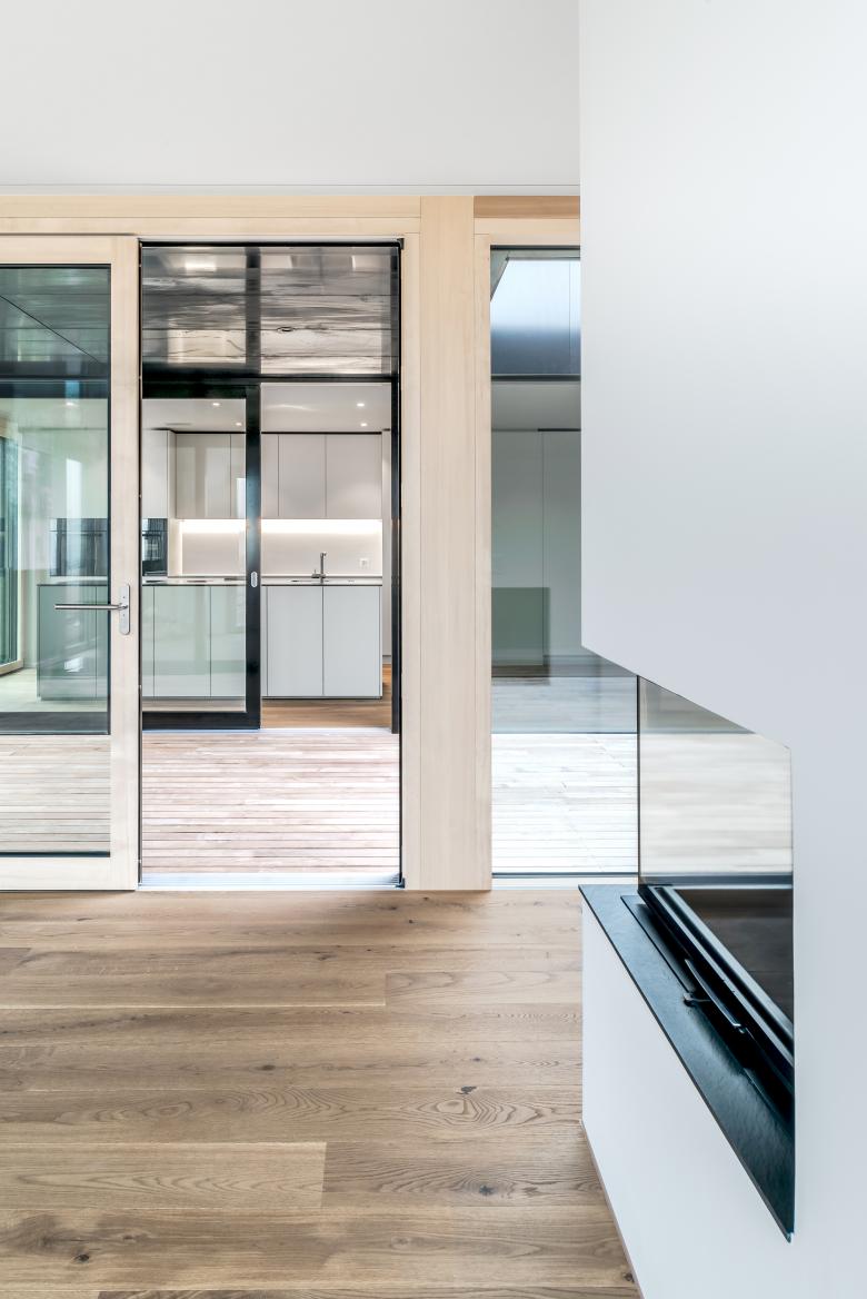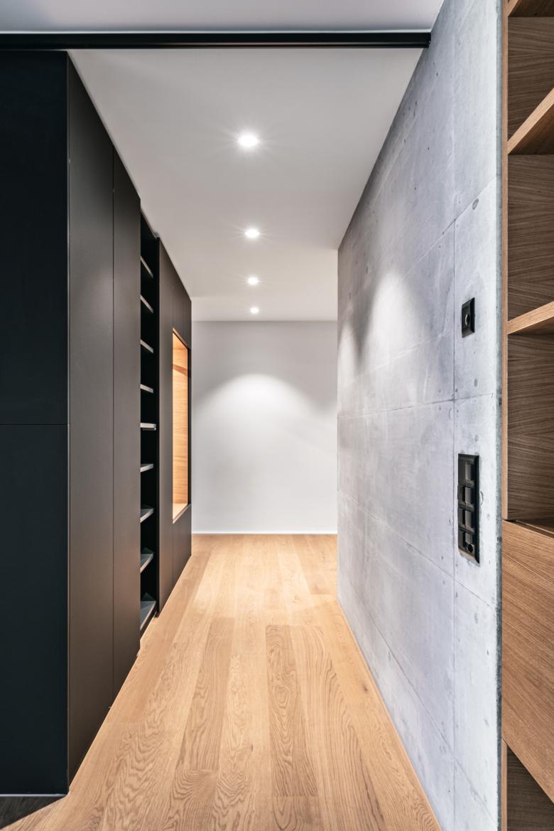 Das Grundstück sieht einen quadratischen Punktbau vor. Die eingezogenen Loggien bewirken eine klare Architektursprache. Der Punktbau bewirkt auch eine wesentlich bessere Verteilung der halbprivaten und privaten Außenräume. Nördlich der Wohnanlage entsteht ein Spielplatz und trotzdem bleibt der Garten der Eigentümer im Erdgeschoss großzügig. Das Gebäude wird in Massivbauweise gebaut. Die Hülle bildet eine geflammte Holzlattenfassade die vorgehängt wird. Die klaren Linien des Gebäudes werden in der Umgebung durch weiche Formen umspielt. Der Garten wird weich und natürlich. Ziel ist es die Fichte und die Föhre im nördlichen Teil des Grundstückes zu erhalten. Mit Gräsern, Buchshecken und heimischen Bäumen wird der Garten gestaltet.
