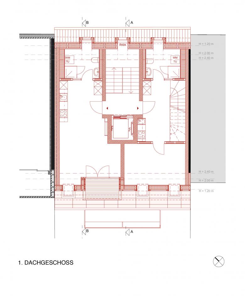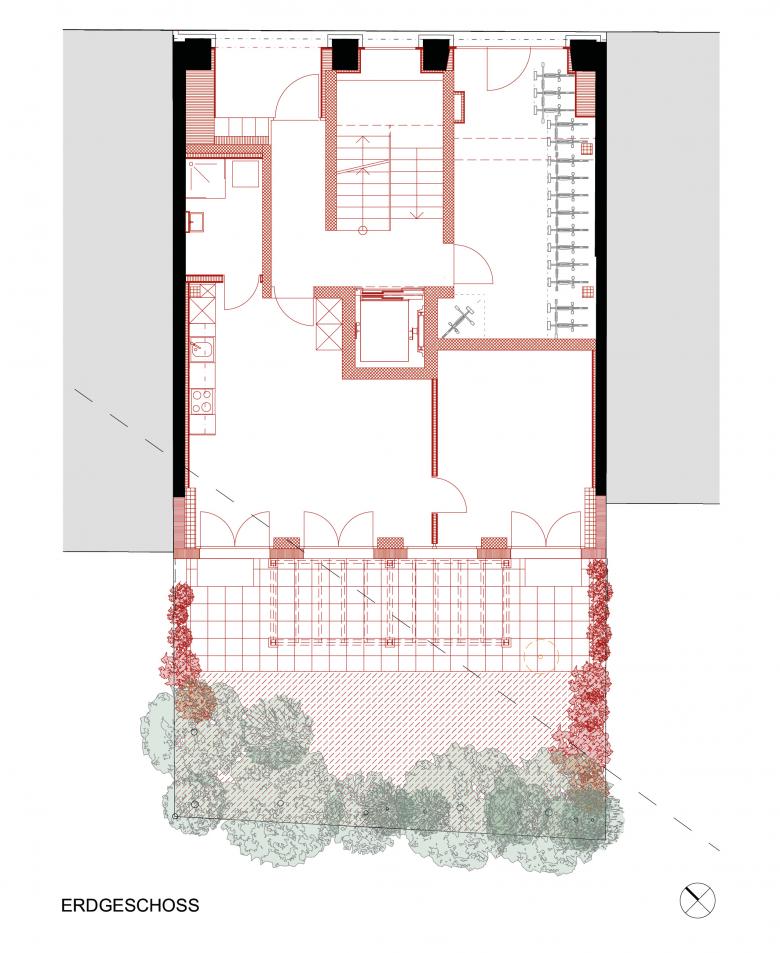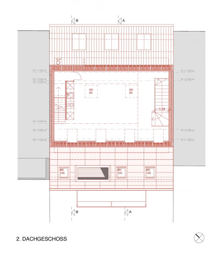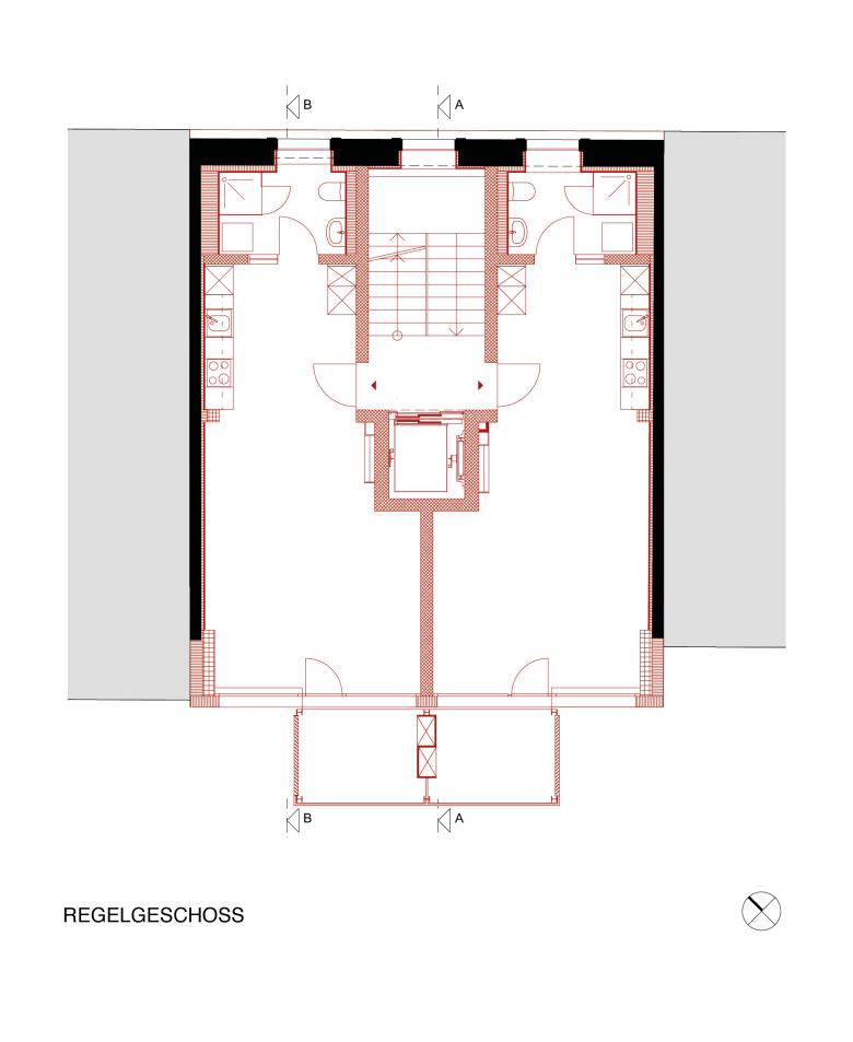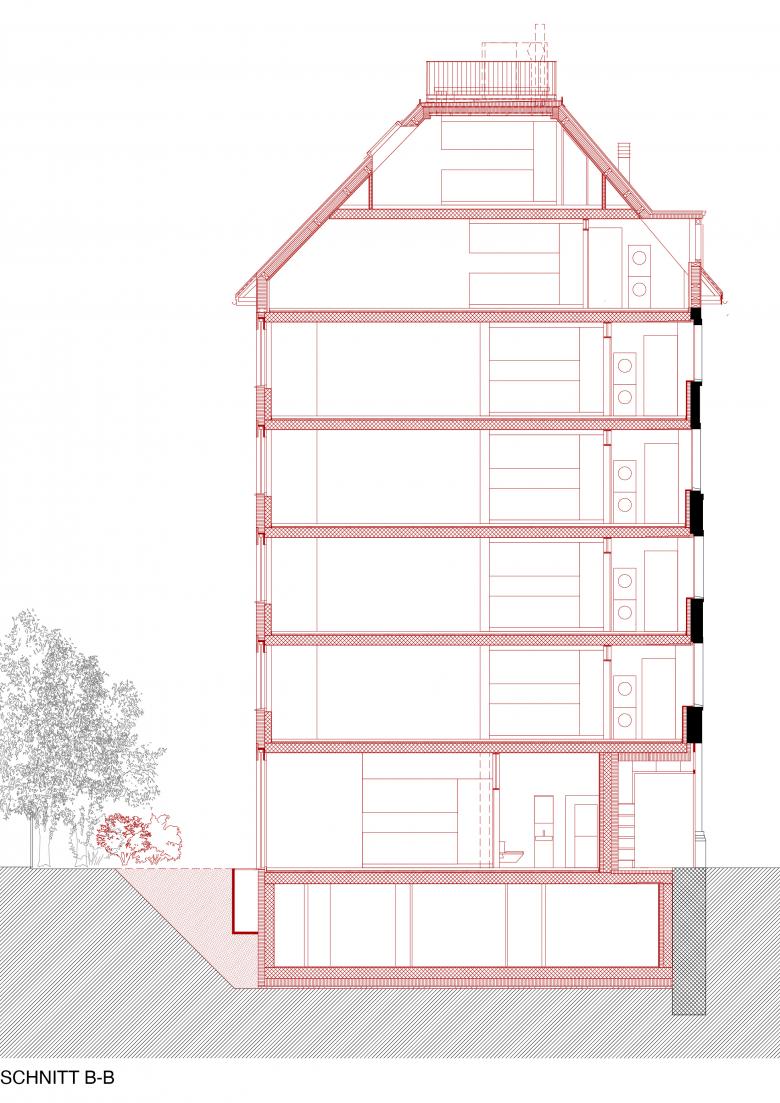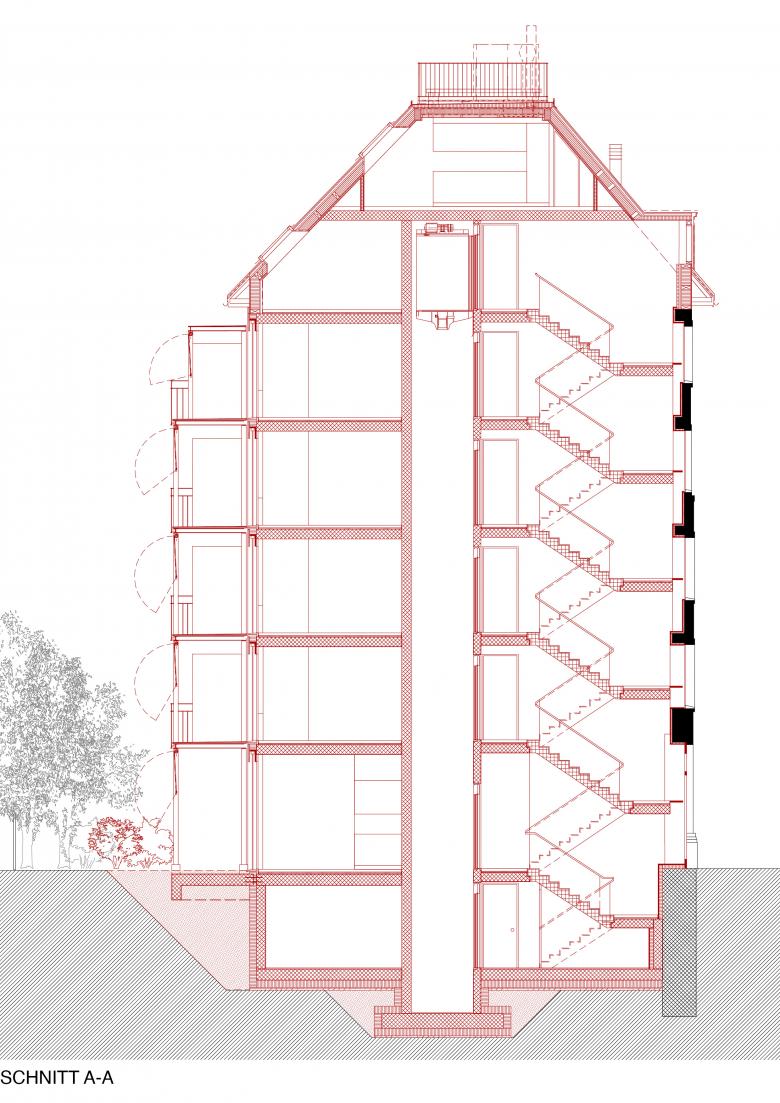 Mit diesem Ansatz können die lärmunempfindlichen Räume wie Treppenhaus und Nasszellen strassenseitig und der Wohn- und Schlafbereich der neun Studios sowie der Duplex-Wohnung lärmabgewandt angeordnet werden. Im Erdgeschoss tritt hofseitig anstelle der Gewerbenutzung und der Garage eine Zweizimmerwohnung, sowie zur Strasse hin orientiert der Veloabstellraum und der eingerückte Hauseingang. Die ursprünglich exzentrisch angeordneten Balkone mussten aufgrund von nachbarschaftlichen Vereinbarungen im zentrischen Balkonturm zusammen-gefasst werden, welcher den Aussenraum für acht Studios bildet. Das Studio im ersten Dachgeschoss verfügt über eine Terrasse im Dacheinschnitt, während die Dachzinne der Maisonettewohnung im ersten und zweiten Dachgeschoss zugeordnet ist.