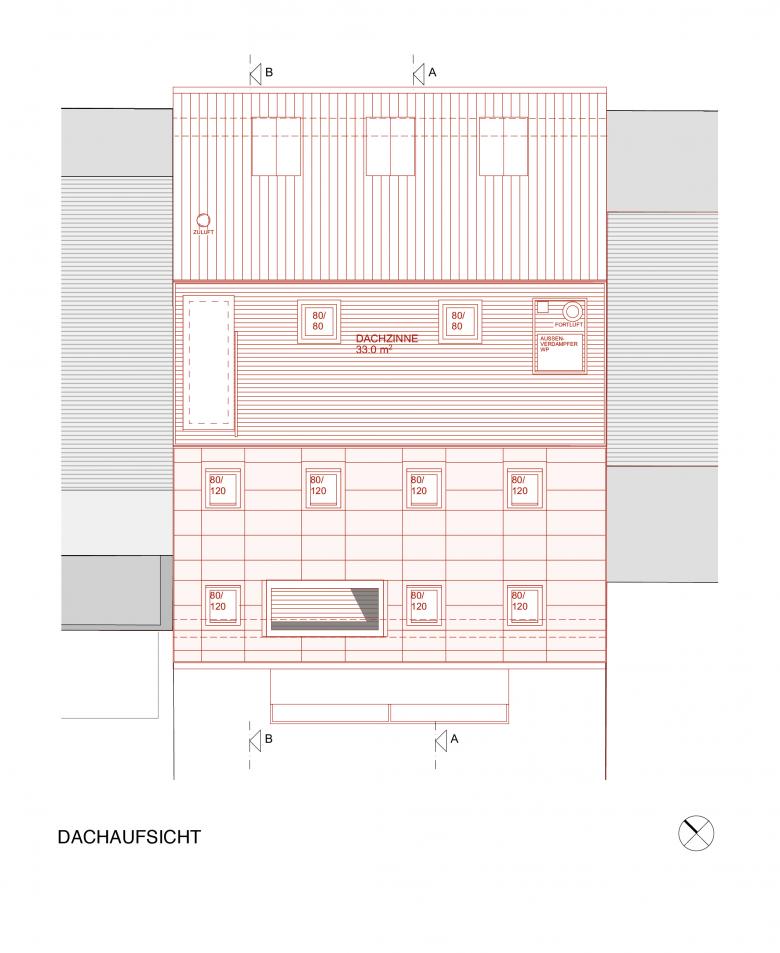 Der im Minergie-Standard geplante Ersatzneubau wird mit einer Luft- Wasser-wärmepumpe in Split- Bauweise beheizt. Sämtliche Wohnungen verfügen über eine Komfortlüftung. Im Gegensatz zu dem mit Eternitschindeln eingedeckten Steildach zur Strasse wird mit der Indach-PV-Anlage des hofseitigen Steildaches Strom generiert. Das Gebäude ist bis und mit der Decke über dem erstem Dachgeschoss als Massivbau geplant, das zweite Dachgeschoss sowie die Steildächer sind jedoch in Holzelementbauweise konstruiert. Die Innendämmung aus Aerogel im Treppen-haus und aus Mineralwolle in den Nasszellen ermöglicht es, die historische Strassen-fassade in ihrer originalen Gestaltung stehen zu lassen.