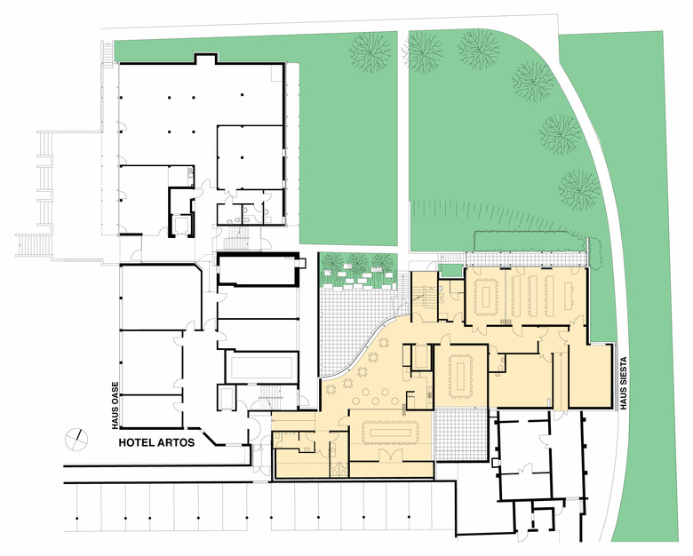 Das Haus Siesta bildet die Erweiterung zu den beiden bestehenden Bauten des Hotel Artos. Das Untergeschoss ist dreiseitig an die bestehenden Gebäude angebaut und weist ein Foyer sowie Seminar- und Gruppenräume auf. Im Erdgeschoss stellt der nach Norden geschwungene Korridor die Verbindung zu den Altbauten her.
