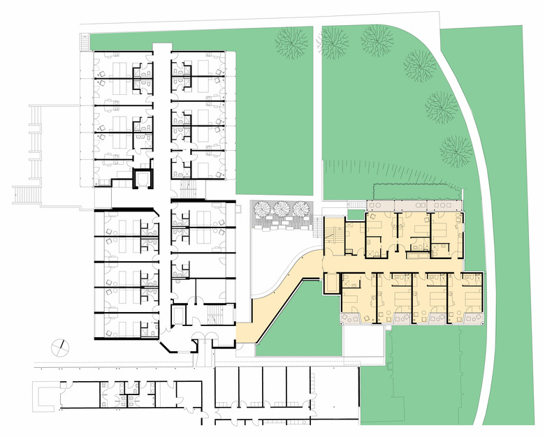 Die Zimmer des Attikageschosses sind mehrheitlich zweiseitig orientiert und weisen einen höheren Ausbaustandard auf. Durch die Fassadenverkleidung aus Holz hebt sich das Dachgeschoss vom verputzten, zweifarbigen Hauptbaukörper ab.