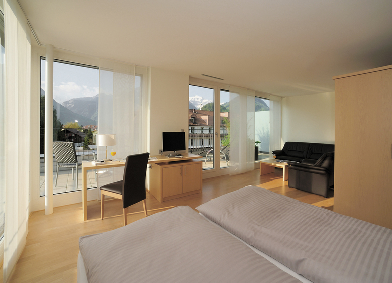 Der Neubau ist rechtwinklig zu den beiden bestehenden Hotelbauten situiert. Die zum Hof hin orientierte Fassade übernimmt die gestalterischen Merkmale des Altbaus wie die Stahl- und Betonkonstruktion der Balkone und die farblos behandelten Holzfenster. Im Gegensatz zur Hoffassade ist der Aussenraum der Südzimmer als Loggia ausgebildet.