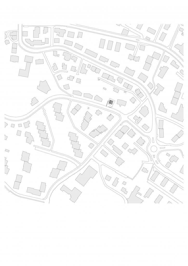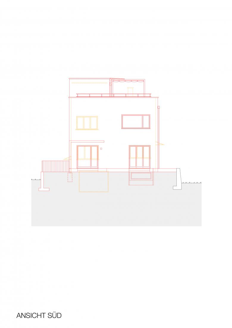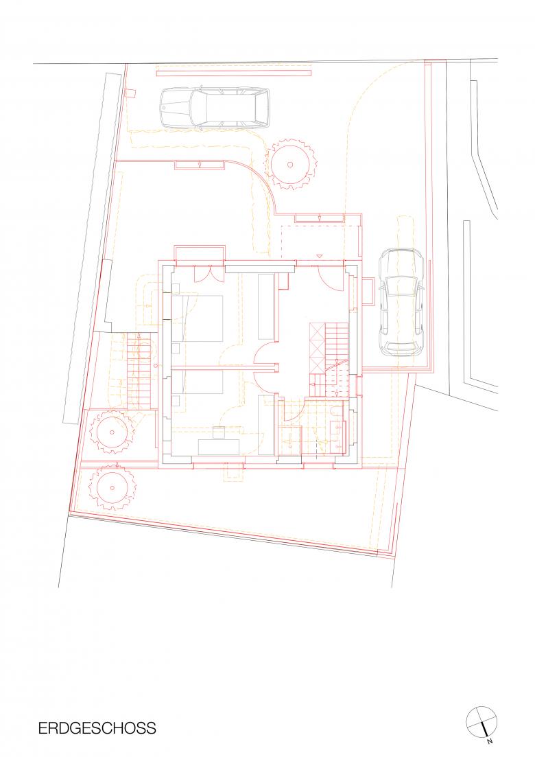 Der vom Untergeschoss aus zugängliche seeseitige Sitzplatz wird mit einer Aussentreppe entlang der Ostfassade mit dem strassenseitigen Vorplatz verbunden. Die L-förmige Stützmauer an der Westfassade ermöglicht einen zusätzlichen Parkplatz auf dem Vorplatz, welcher in zwei Niveaus gegliedert ist. Dem Bestand entsprechend hebt sich das Sockelgeschoss farblich von den oberen