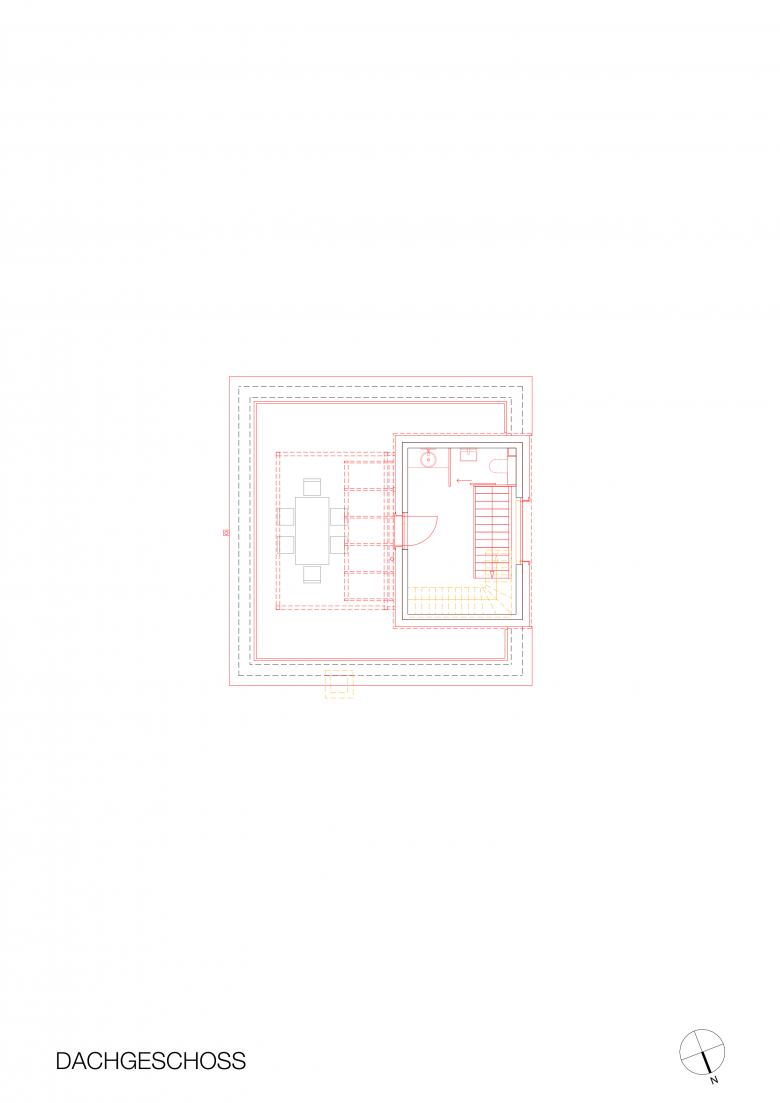 Das Verlegen des Wohngeschosses vom Erdgeschoss in das Obergeschoss hat den Vorteil, dass einerseits die besonders schöne Aussicht auf den Zürichsee vom Wohn- und Essbereich aus genossen werden kann und andererseits die Küche mit der Dachterrasse über nur einen Treppenlauf verbunden ist. Im Obergeschoss wurden sämtliche inneren Wände abgebrochen, so dass nun die Lasten des Dachgeschosses allein über einen Doppel-T-Stahlträger mit einer Stahlstütze abgetragen werden. Der beinahe quadratische Raum wird von Fenstern aus allen vier Himmelsrichtungen belichtet und öffnet sich mit dem fassadenbündigen grossen Eckfenster zum Zürichsee hin. Der Zugang zur Dachterrasse erfolgt über den kleinen Raum im Dachgeschoss, welcher die dritte Nasszelle und eine Abwaschgelegenheit enthält. Die Pergola mit einem integrierten Raffsegel und einer mit bifacialen Photovoltaik-Modulen gedeckten Zone werten die Dachterrasse auf. Im Erdgeschoss sind die beiden Schlafzimmer sowie das Badezimmer angeordnet.