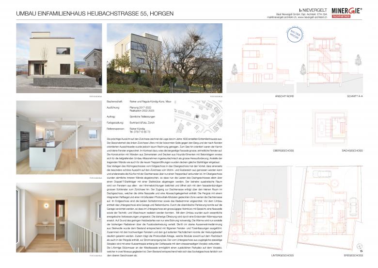 Die Wärme wird nun anstelle der bisherigen Radiatoren über die Fussboden-heizung verteilt. Die18 cm starke Aussenwärmedämmung aus Steinwolle wurde dem Bestand entsprechend mit filigranen Fenster- und Türeinfassungen ausgeführt. Zusammen mit den hochwertigen Fenstern und den gut isolierten Flachdächern konnte der Heizungsbedarf deutlich gesenkt werden. Zudem trägt die Photovoltaik-Anlage, welche Module sowohl auf dem Flachdach als auch in der Pergola enthält, zur Stromversorgung bei.