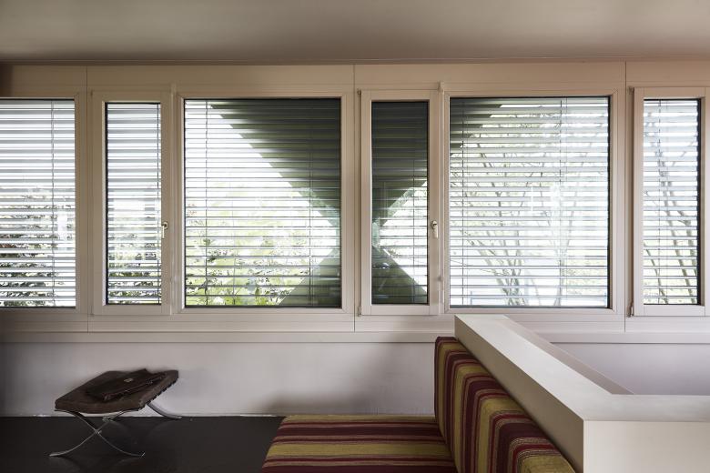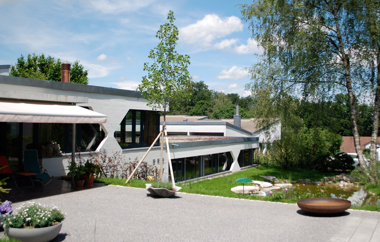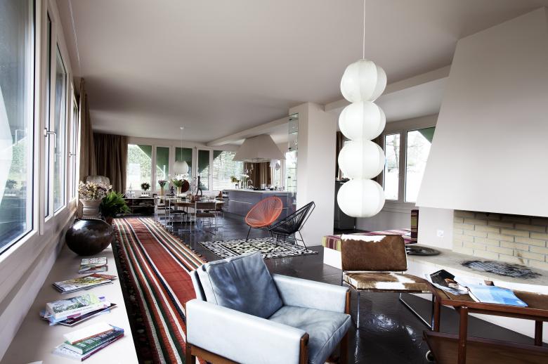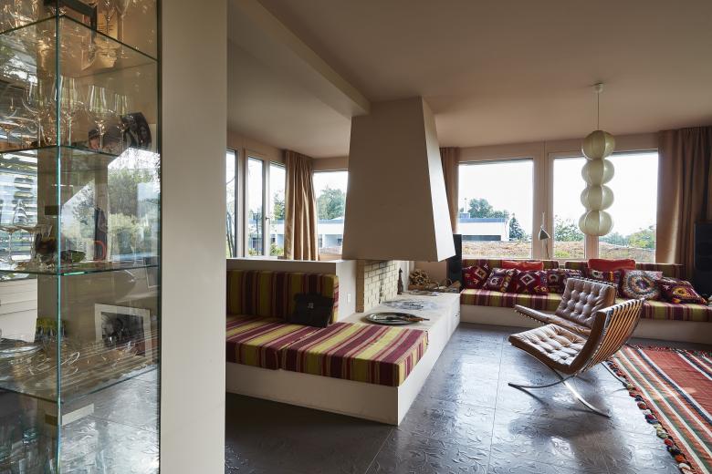 Die Umnutzung dieses Gewerbebaus zu Wohnzwecken wurde Ende 2011 geplant und Anfangs 2012 in Zusammenarbeit mit Dolenc Scheiwiller Architekten AG und Pasquale Baurealisation AG ausgeführt. Der rund 70m2 grosse allseitig belichtete Erdgeschossraum enthält den Wohn-, Ess- und Kochbereich. Die Sideboards vor den Fensterbrüstungen schliessen im Wohnbereich direkt an das eingebaute Sofa, das vom Cheminée unterbrochen wird. Das grosse Treppenauge stellt eine räumliche Verbindung zwischen dem Erd- und Untergeschoss dar. Auch die Schlafräume sind mit durchlaufenden Sideboards unterhalb der Bandfenster ausgestattet. Die mit einem Blumenmuster versehenen, grossformatigen Feinsteinzeugplatten bilden den Bodenbelag und wurden auch an den Wänden der Nasszellen verwendet. Die Weissputz-Wände- und Decken wurden in einem hellen Beige-Ton gestrichen, welcher durch die hellbraunen Vorhänge ergänzt wird. Die hellgrünen Farbaktente auf der Innenseite der X-förmigen Betonstützen erzeugen ein spannungsvolles Farbspiel.