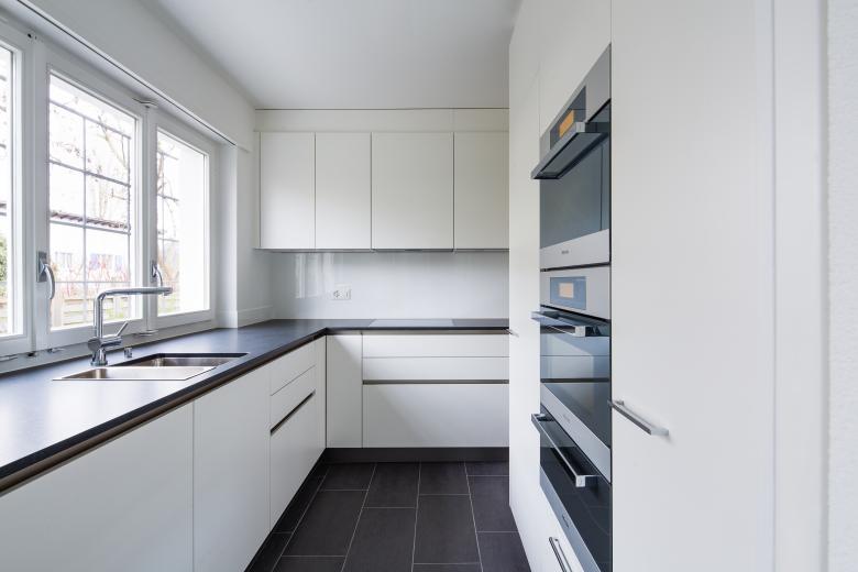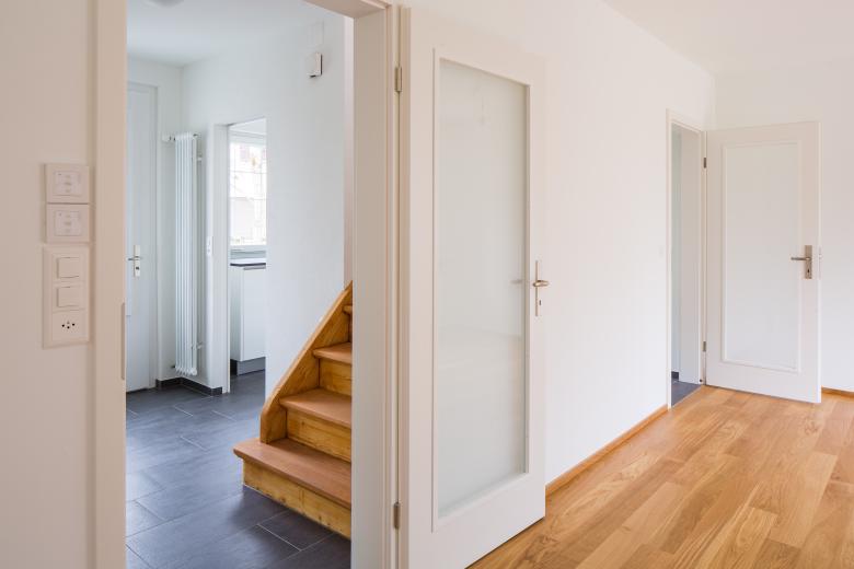 Ein einfaches Materialkonzept mit Eichenparkett in den Zimmer und keramischen Platten in den Nasszellen, dem Eingangsraum und in der Küche unterstreichen die schlichte Architektur des Bestandes.
