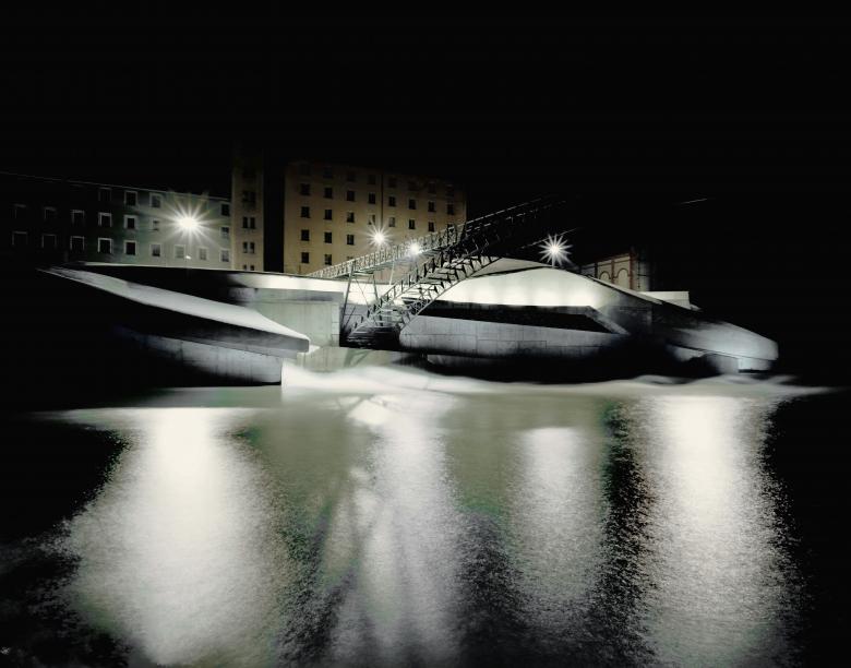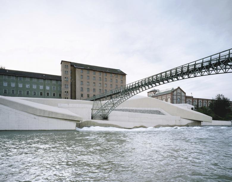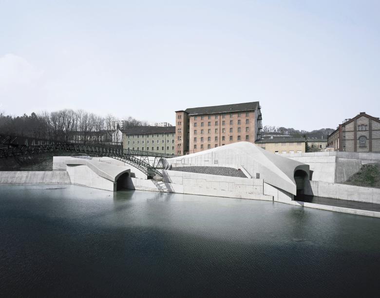 Unsere Konzeption sieht vor, die beiden Endpunkte Krafthaus (mit Generatoren und Transformator) und Staubalkenwehr (mit Rechenreinigungsanlage) mit einer durchgängigen Gebäudehülle zu verbinden, die ungefähr in der Mitte unter dem historischen Stahlfachwerk - Bogen des Kabelsteges hindurchtaucht. Dieses weich geformte Hüllvolumen bietet Raum für die vielfältigsten Assoziationen, die von `Welle` über `geschliffener Flußstein` bis `Gestandeter Wal` reichen können.