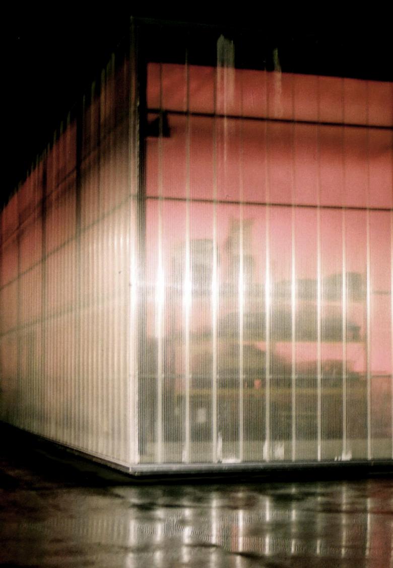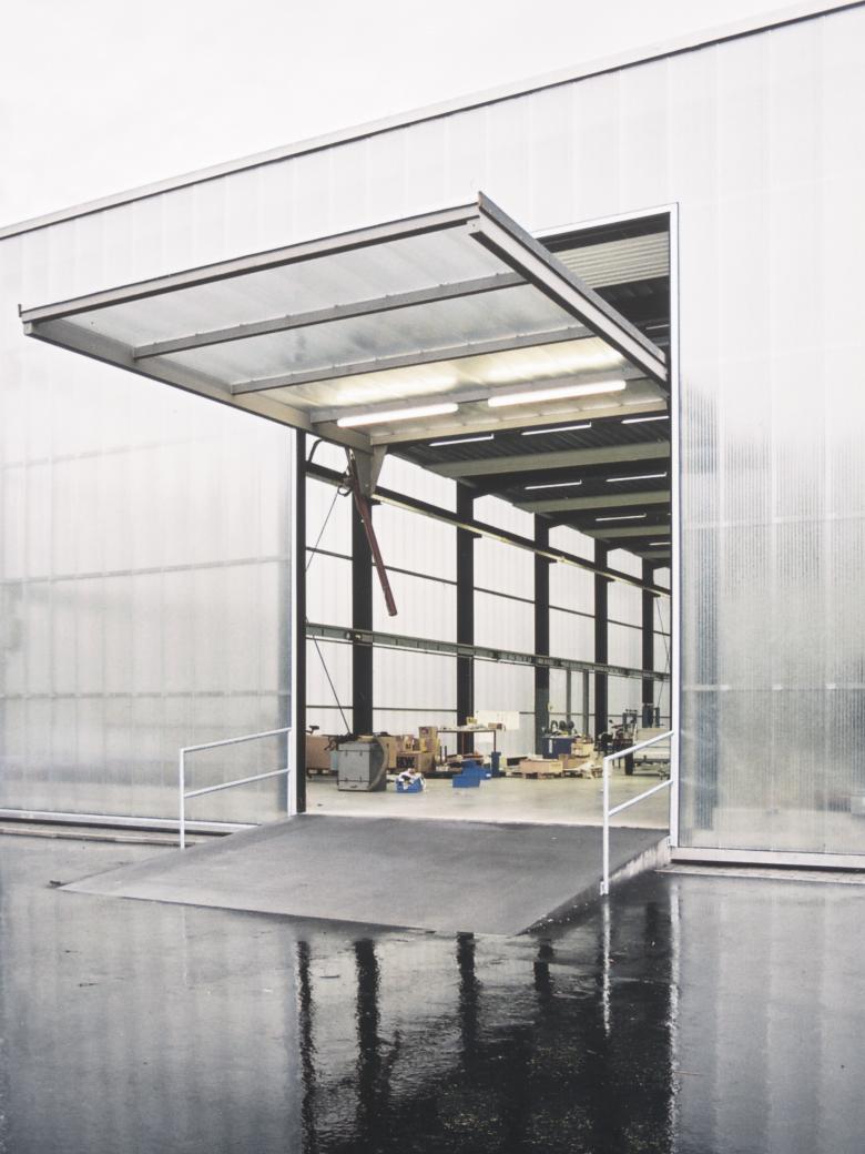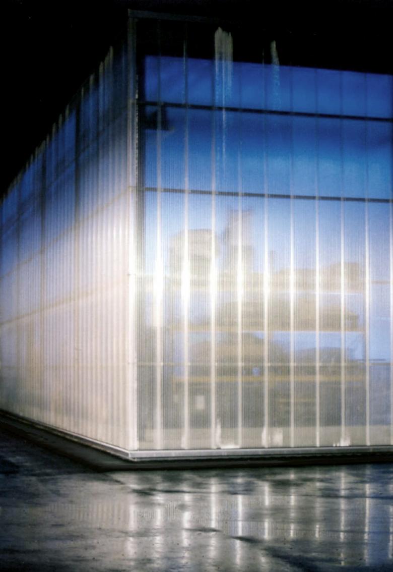 Die eigentliche Fertigungshalle mit ca. 1000 m2 Nutzfläche besteht aus einem kostengünstigen Stahltragwerk, das vierseitig mit Mehrfachstegplatten aus Polycarbonat umhüllt wurde – dem Wunsch der Nutzer folgend, eine helle, blendfreie Hallenatmosphäre zu schaffen. Die transluzente Außenhaut reagiert auf unterschiedliche Wetter- und Belichtungsverhältnisse und verleiht dem Gebäude ein opakes, geheimnisvolles Äußeres, das die Firmenphilosophie unterstützt. Besonders in den Abend- und Nachtstunden fungiert der hinterleuchtete Baukörper quasi in seiner Gesamtheit als Werbe- und Imageträger. Mittlerweile wurde auch eine dynamische Lichtführung mittels sog. RGB – Licht installiert, wodurch weiche Farbverläufe generiert und zeitlich aufeinander abgestimmte Farbsequenzen auf die Innenfassade projiziert werden können. Die Komposition orientiert sich an den vier Jahreszeiten mit den Schwer-punktfarben Blau (Winter), Grün (Frühjahr), Rot (Sommer) und Gelb (Herbst) und sorgt auf diese Weise im über-tragenen Sinne für eine Rekultivierung des kontaminierten Ortes inmitten einer landschaftlich intakten Umgebung.