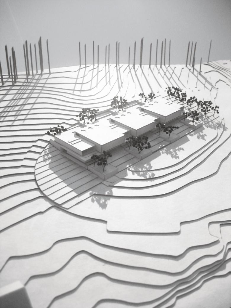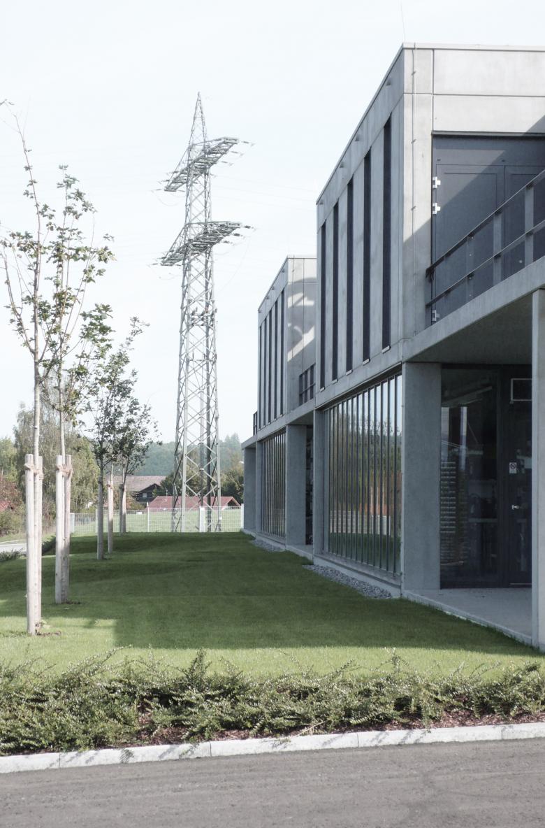 Die plastische Baukörperformulierung mit Vor- und Rücksprüngen trägt zum kleinteiligen Erscheinungsbild ebenso bei wie der differenzierte Diagonalrythmus zwischen verglasten und geschlossenen Fassadenflächen bei den Längsansichten. Während sich die `Spuren` mit der Topographie verzahnen, fließt das Gelände praktisch natürlich durch die Hallenbereiche hindurch. Die monolithische Materialisierung aus kerngedämmten Stahlbetonfertigteilen lässt das Gesamtensemble wie einen Findling in der Landschaft erscheinen.
